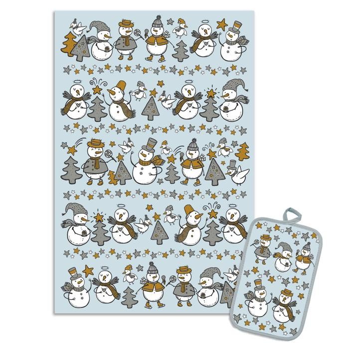 Кухонный набор Снеговики и елки (полотенце 39×60+прихватка 14×22), серо-голубой, хл100%