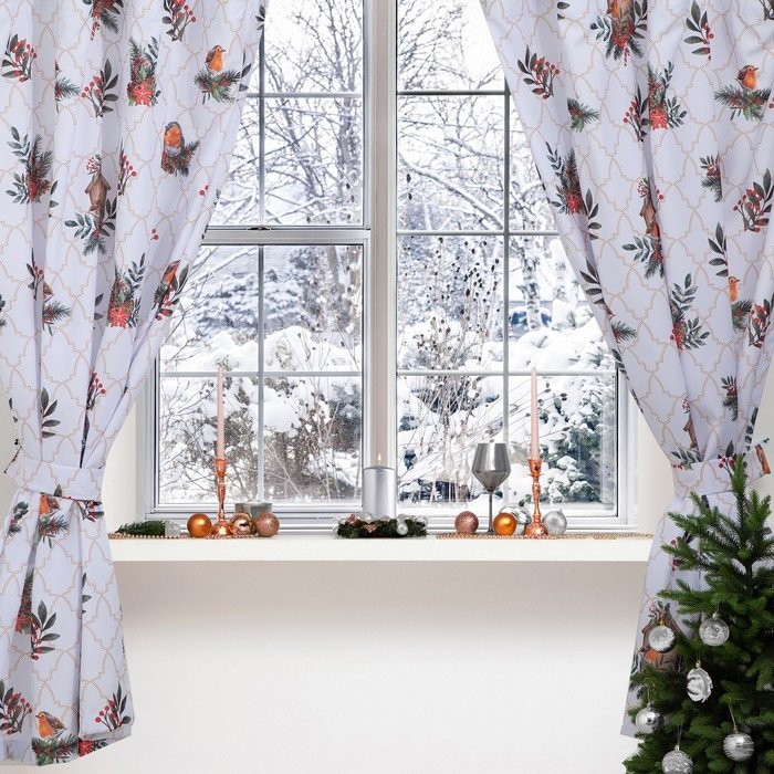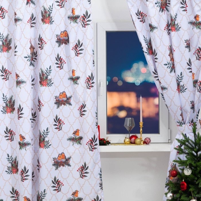 Новогодний комплект штор для кухни с подхватами «Beautiful birds» 145х180см-2 шт., габардин