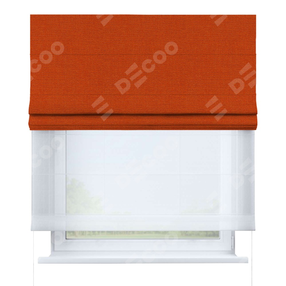 Римская штора день-ночь производителя «Cortin», используется для проёма, пошита из двух полотен, с лицевой стороны лён терракотовый артикул 53440, вторая ткань тюль (по стандарту комплектуется тюль белого цвета артикул V-01). Имеет универсальный механизм и подходит для монтажа: на потолок, на стену и в нишу.