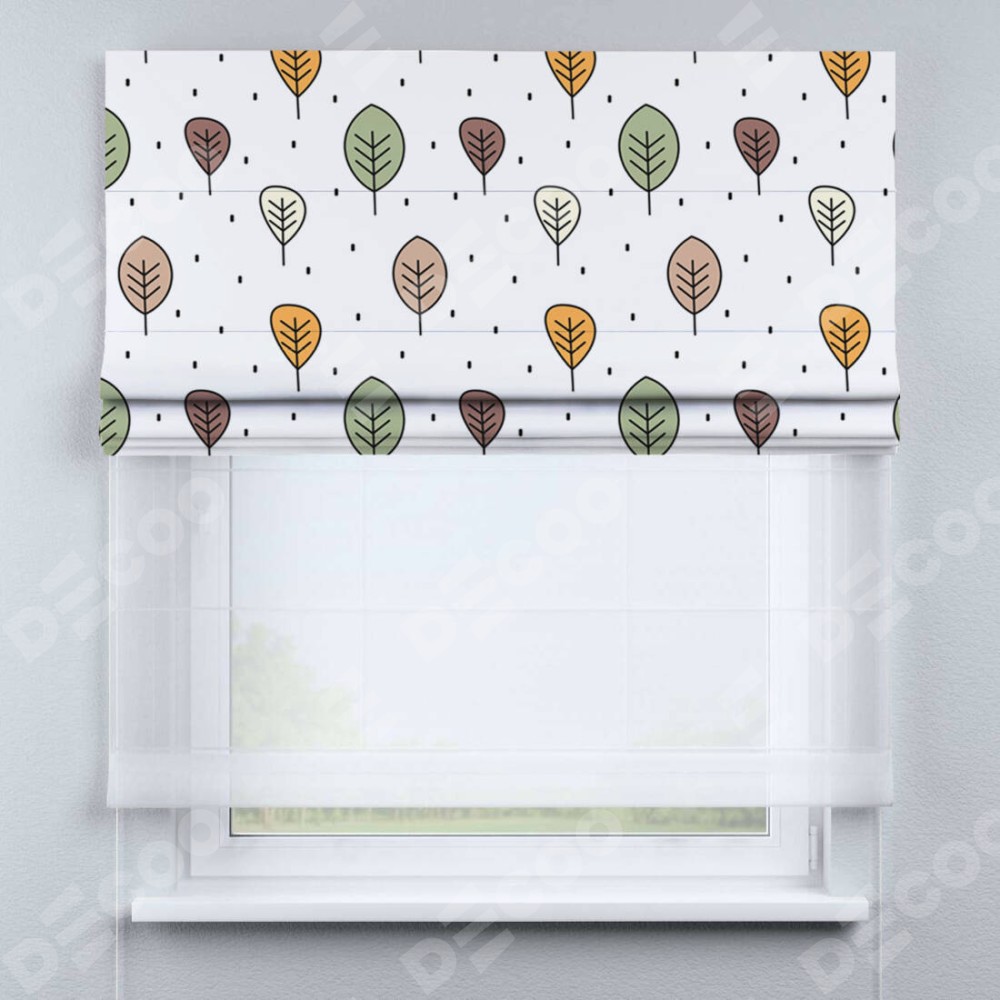 Римская штора день-ночь производителя «Cortin», используется для проёма, пошита из двух полотен, с лицевой блэкаут с нанесением сублимационной печати «Простые деревья», вторая ткань тюль (по стандарту комплектуется тюль белого цвета артикул V-01). Имеет универсальный механизм и подходит для монтажа: на потолок, на стену и в нишу.