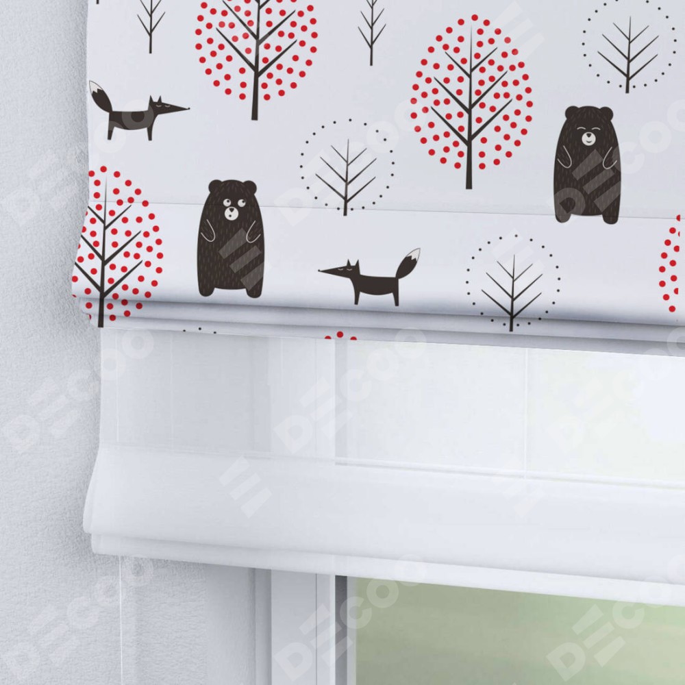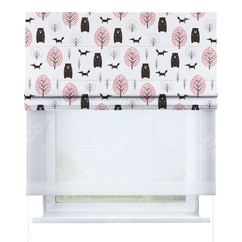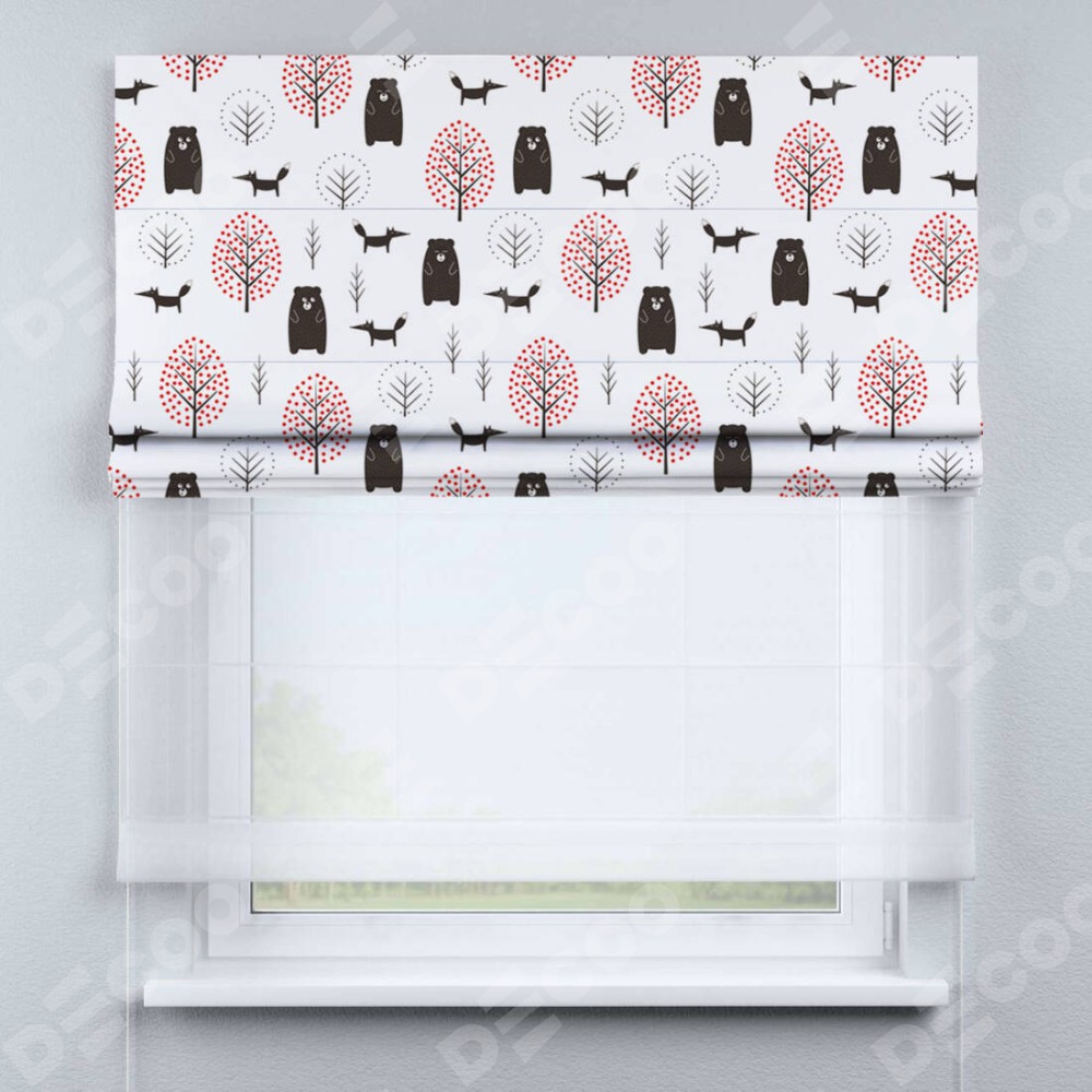 Римская штора день-ночь производителя «Cortin», используется для проёма, пошита из двух полотен, с лицевой блэкаут с нанесением сублимационной печати «Сканди лес», вторая ткань тюль (по стандарту комплектуется тюль белого цвета артикул V-01). Имеет универсальный механизм и подходит для монтажа: на потолок, на стену и в нишу.