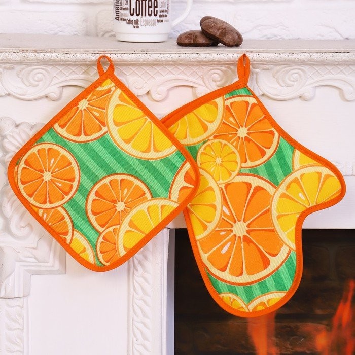 Набор кухонный Апельсинки 227 (варежка+прихватка), зеленый, хл, рогожка