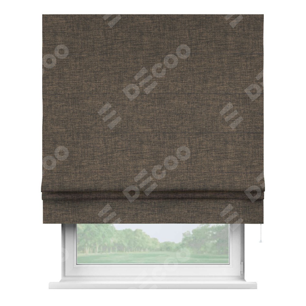 Римская штора производителя «Cortin», используется для проёма, пошита из ткани рогожка димаут коричневый, артикул ткани 80420. Имеет универсальный механизм и подходит для монтажа: на потолок, на стену и в нишу.
