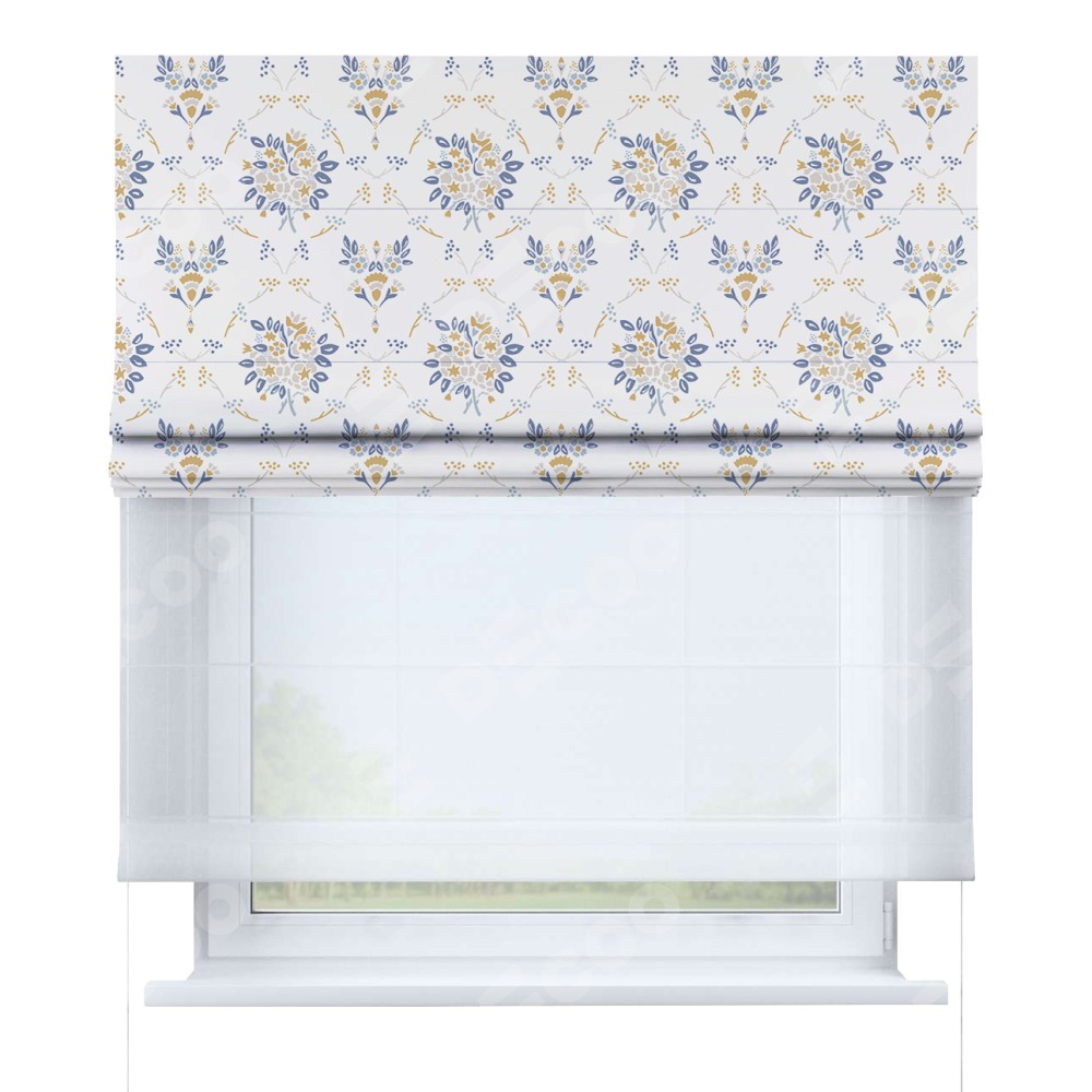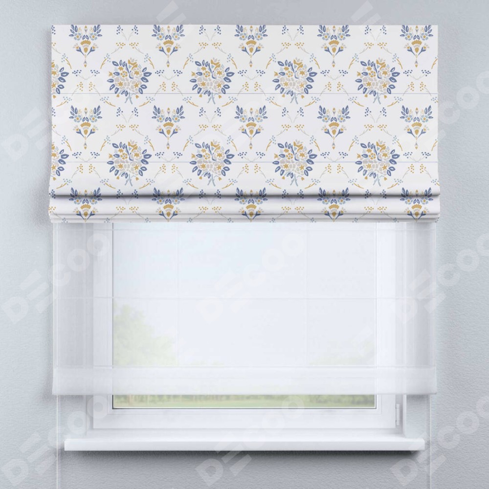 Римская штора день-ночь производителя «Cortin», используется для проёма, пошита из двух полотен, с лицевой блэкаут с нанесением сублимационной печати «Французский цветок», вторая ткань тюль (по стандарту комплектуется тюль белого цвета артикул V-01). Имеет универсальный механизм и подходит для монтажа: на потолок, на стену и в нишу.