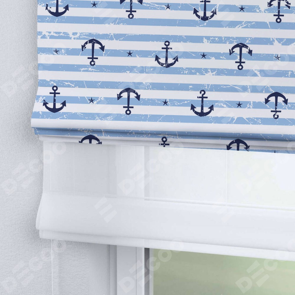 Римская штора «Кортин» день-ночь «Полоски и якори» отлично подойдёт для интерьера: на балкон, подростку в комнату и в кухню.