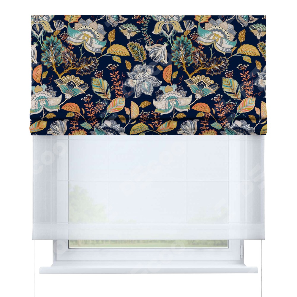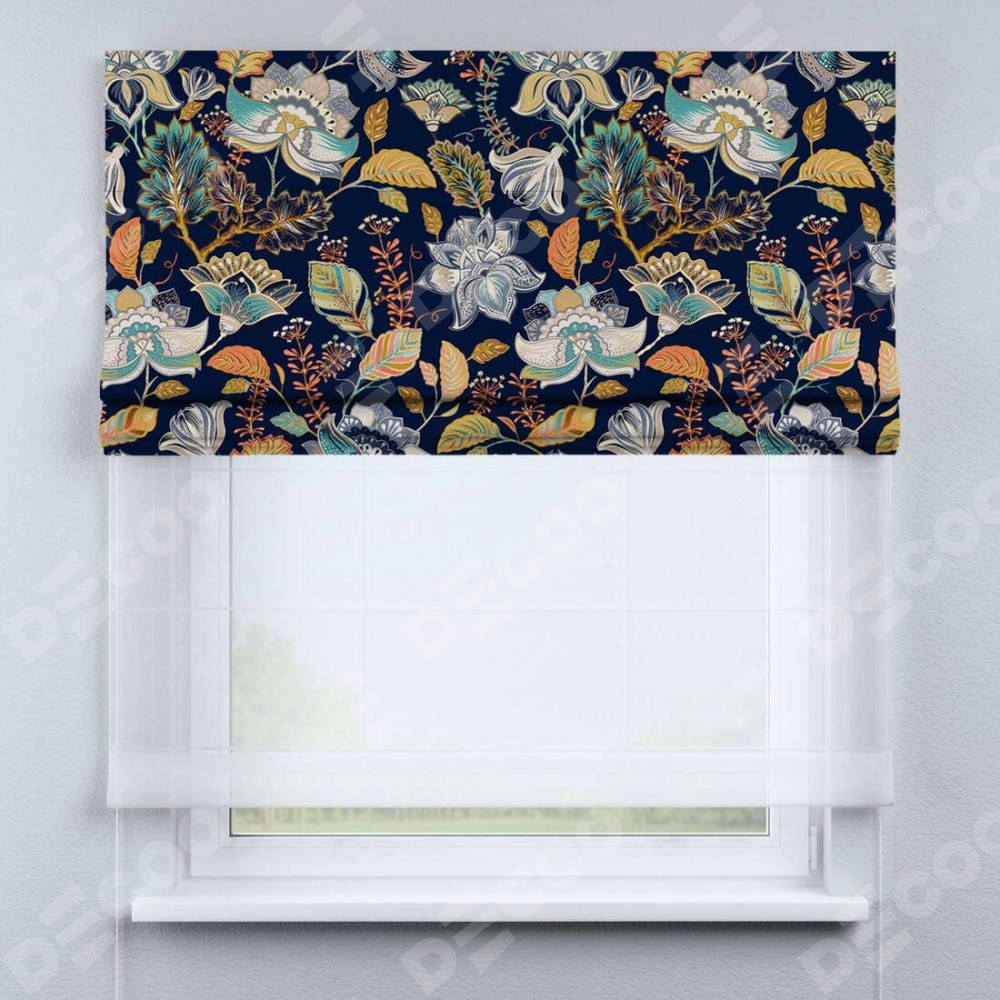 Римская штора день-ночь производителя «Cortin», используется для проёма, пошита из двух полотен, с лицевой блэкаут с нанесением сублимационной печати «Тёмный букет», вторая ткань тюль (по стандарту комплектуется тюль белого цвета артикул V-01). Имеет универсальный механизм и подходит для монтажа: на потолок, на стену и в нишу.