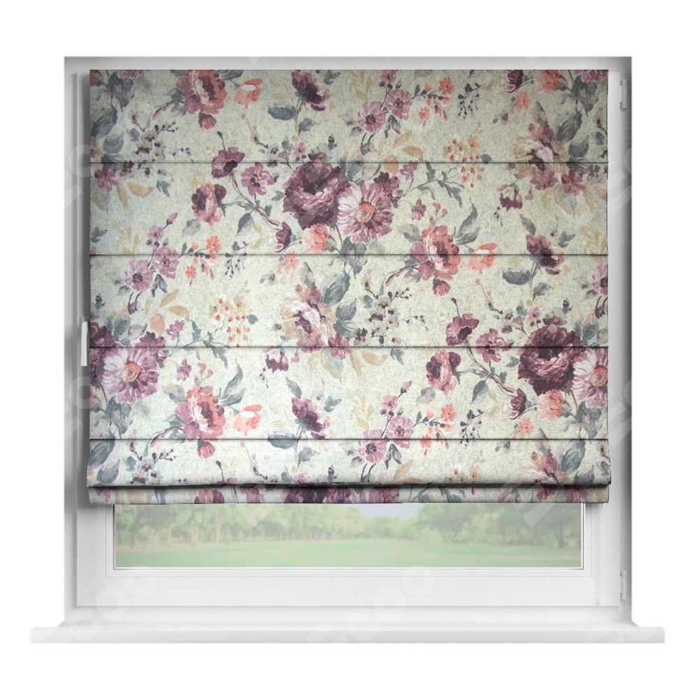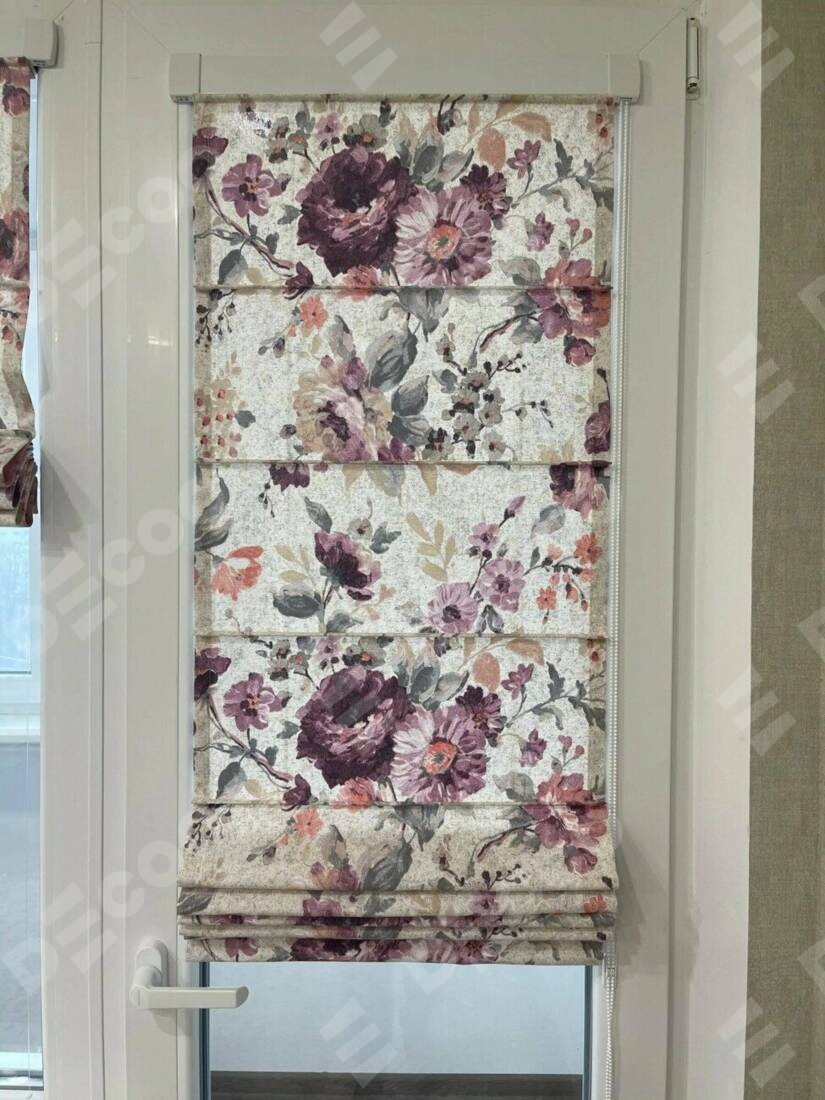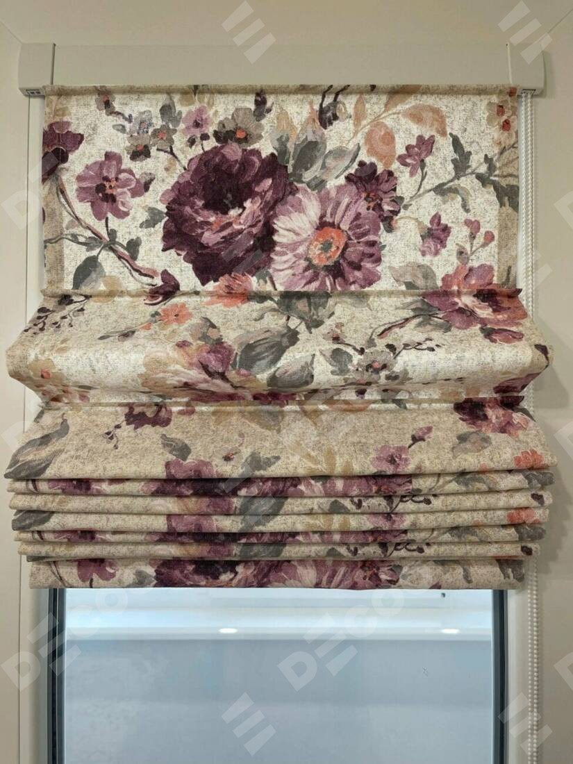 Римская штора производителя «Cortin», устанавливается на створку окна, пошита из ткани «Пионы». Штора шьётся по индивидуальным размерам, для данного типа римской шторы возможная ширина от 35 до 150 см., высота до 250 см.