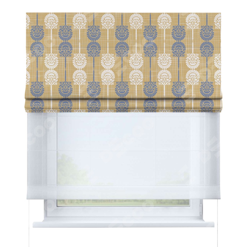 Римская штора день-ночь производителя «Cortin», используется для проёма, пошита из двух полотен, с лицевой блэкаут с нанесением сублимационной печати «Венок из ромашки», вторая ткань тюль (по стандарту комплектуется тюль белого цвета артикул V-01). Имеет универсальный механизм и подходит для монтажа: на потолок, на стену и в нишу.