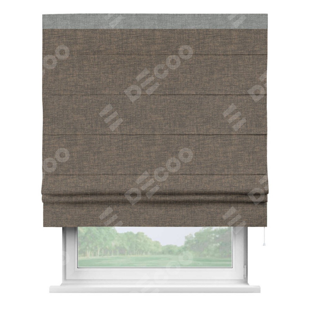Римская штора производителя «Cortin», используется для проёма, пошита из ткани рогожка димаут коричневый, артикул 80420. Отделка шторы кантом «Кинг», ткань для канта используется из рогожки димаут разной расцветки на выбор. Имеет универсальный механизм и подходит для монтажа: на потолок, на стену и в нишу.