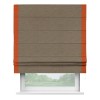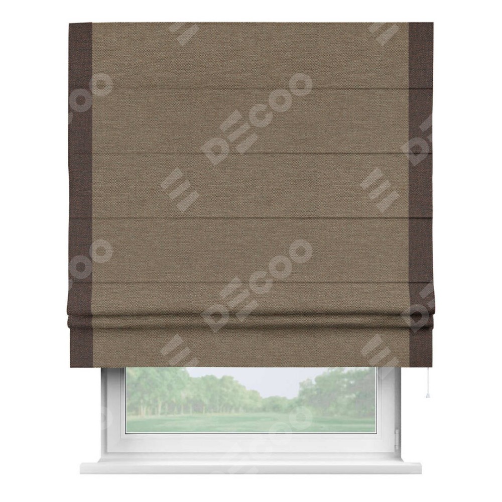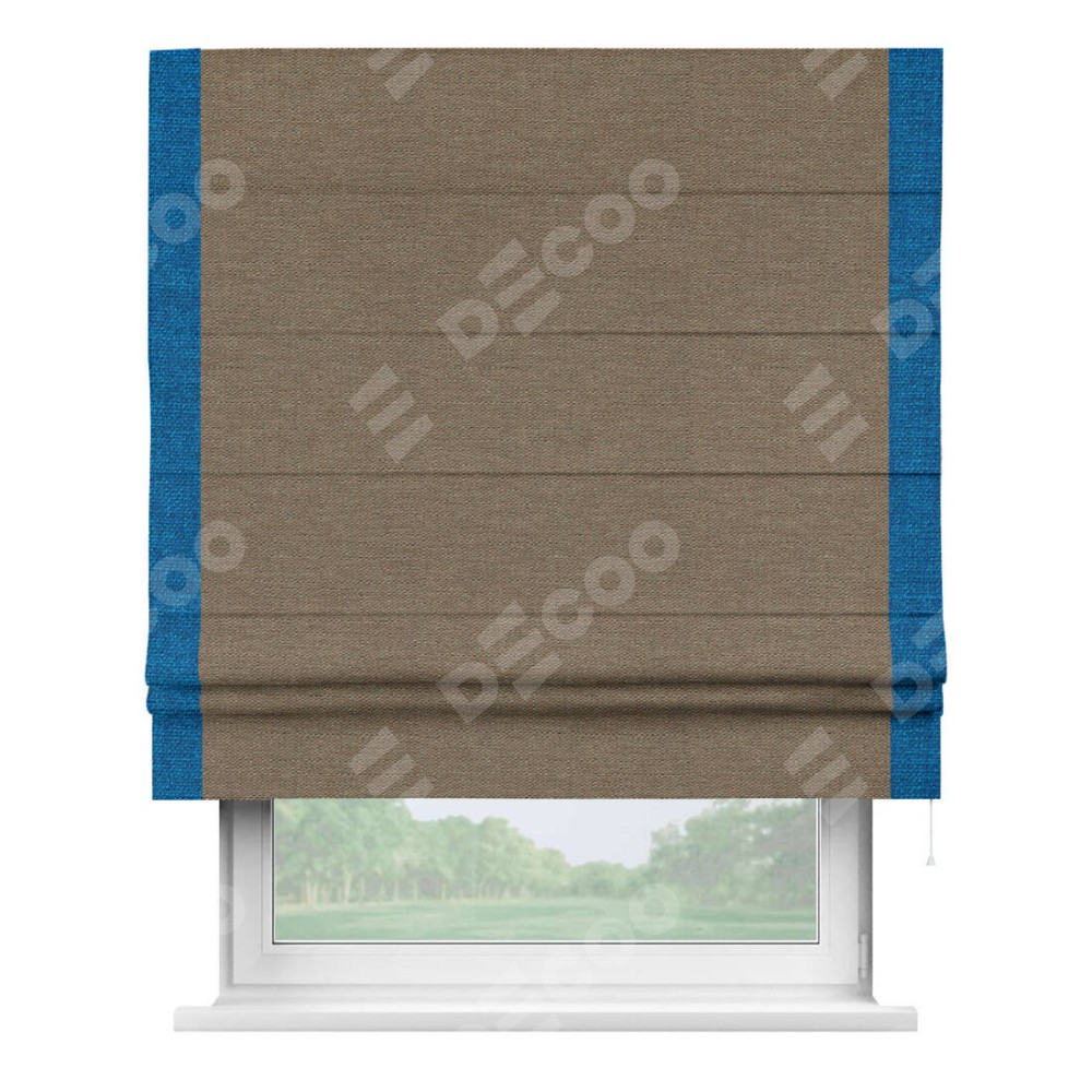 Римская штора производителя «Cortin», используется для проёма, пошита из ткани лён светло-коричневый, артикул 53434. Отделка шторы кантом «Стрим Дуо», ткань для канта используется из льна разной расцветки на выбор. Имеет универсальный механизм и подходит для монтажа: на потолок, на стену и в нишу.