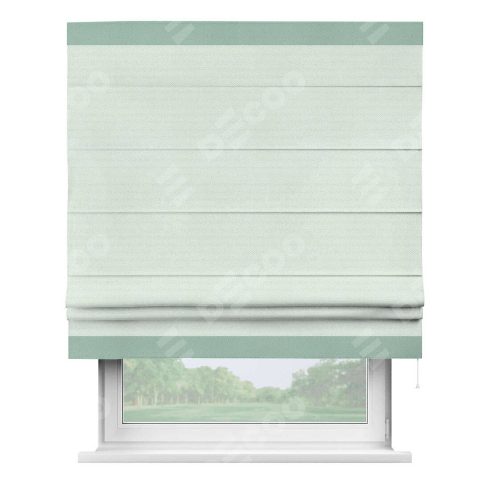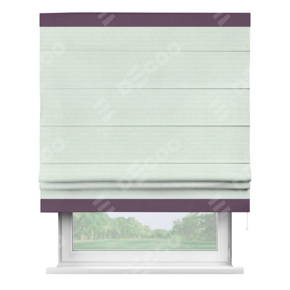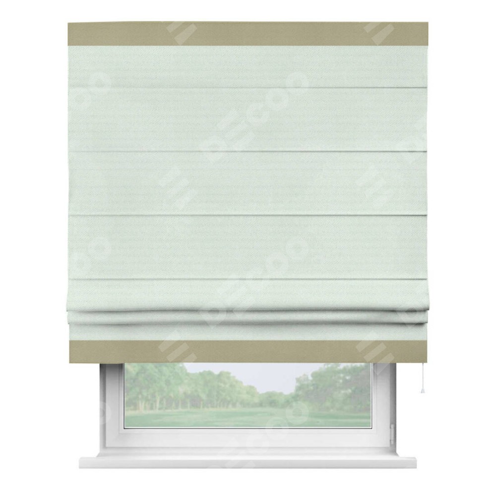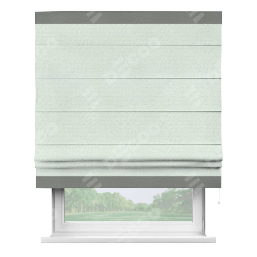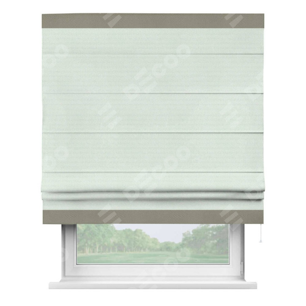 Римская штора производителя «Cortin», используется для проёма, пошита из ткани блэкаут однотонный дымчато-молочный, артикул ткани 88282. Отделка шторы кантом «Горизонт», ткань для канта используется из блэкаута однотонного разной расцветки на выбор. Имеет универсальный механизм и подходит для монтажа: на потолок, на стену и в нишу.