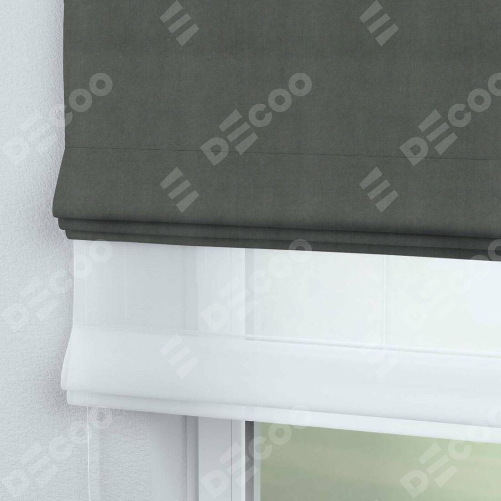 Римская штора день-ночь производителя «Cortin», используется для проёма, пошита из двух полотен, с лицевой стороны вельвет тёмно-серый артикул 85542, вторая ткань тюль (по стандарту комплектуется тюль белого цвета артикул V-01). Имеет универсальный механизм и подходит для монтажа: на потолок, на стену и в нишу.