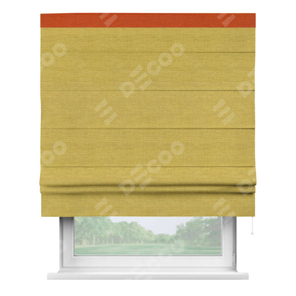 Римская штора производителя «Cortin», используется для проёма, пошита из ткани лён светло-салатовый, артикул 53438. Отделка шторы кантом «Кинг», ткань для канта используется из льна разной расцветки на выбор. Имеет универсальный механизм и подходит для монтажа: на потолок, на стену и в нишу.
