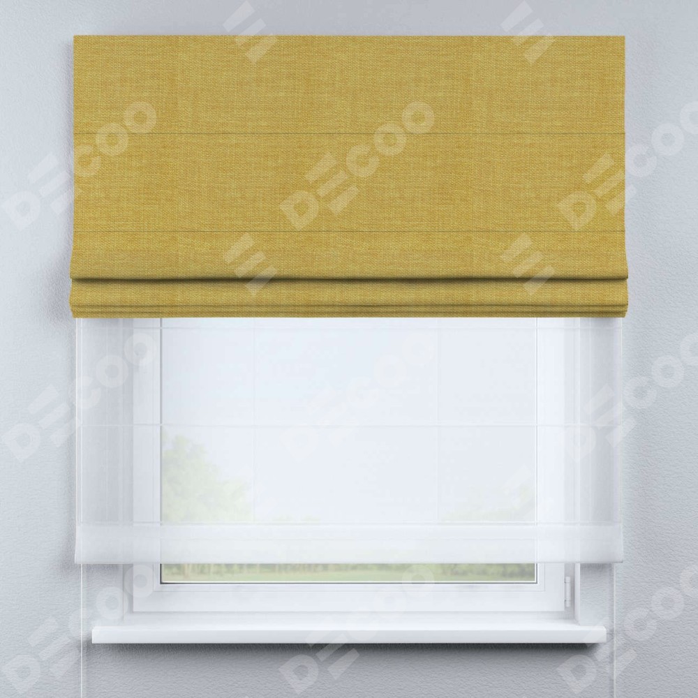 Римская штора день-ночь производителя «Cortin», используется для проёма, пошита из двух полотен, с лицевой стороны лён горчичный артикул 74740, вторая ткань тюль (по стандарту комплектуется тюль белого цвета артикул V-01). Имеет универсальный механизм и подходит для монтажа: на потолок, на стену и в нишу.