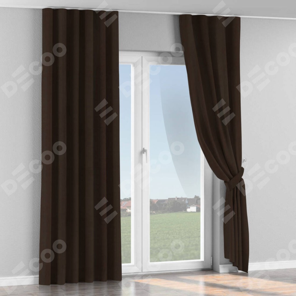 Комплект прямых штор, от производителя «Cortin», пошиты из ткани блэкаут однотонный венге, артикул ткани 88286. С изнаночной стороны в верхней части штор пристрачивается шторная лента с декоративными складками «Волна». Для создания элегантных складок прямые шторы шьются по стандарту с коэффициентом 1:2 (на 100 см. ширины проёма 200 см. ширины ткани).