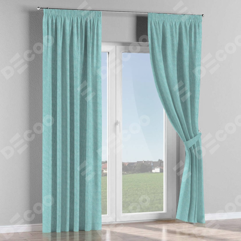 Комплект прямых штор, от производителя «Cortin», пошиты из ткани лён димаут бирюзовый, артикул ткани 23. С изнаночной стороны в верхней части штор пристрачивается шторная лента с декоративными складками «Карандаш». Для создания элегантных складок прямые шторы шьются по стандарту с коэффициентом 1:2 (на 100 см. ширины проёма 200 см. ширины ткани).