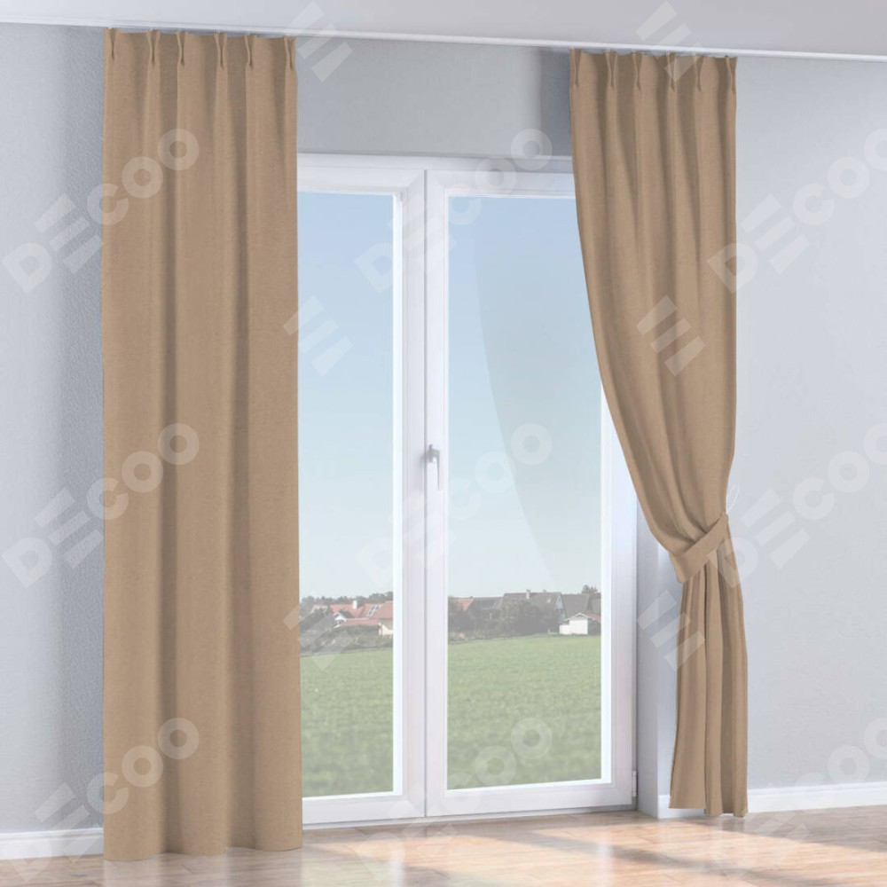 Комплект прямых штор, от производителя «Cortin», пошиты из ткани лён димаут светло-бежевый, артикул ткани 00002. С изнаночной стороны в верхней части штор пристрачивается шторная лента с декоративными складками «Кустик». Для создания элегантных складок прямые шторы шьются по стандарту с коэффициентом 1:2 (на 100 см. ширины проёма 200 см. ширины ткани).