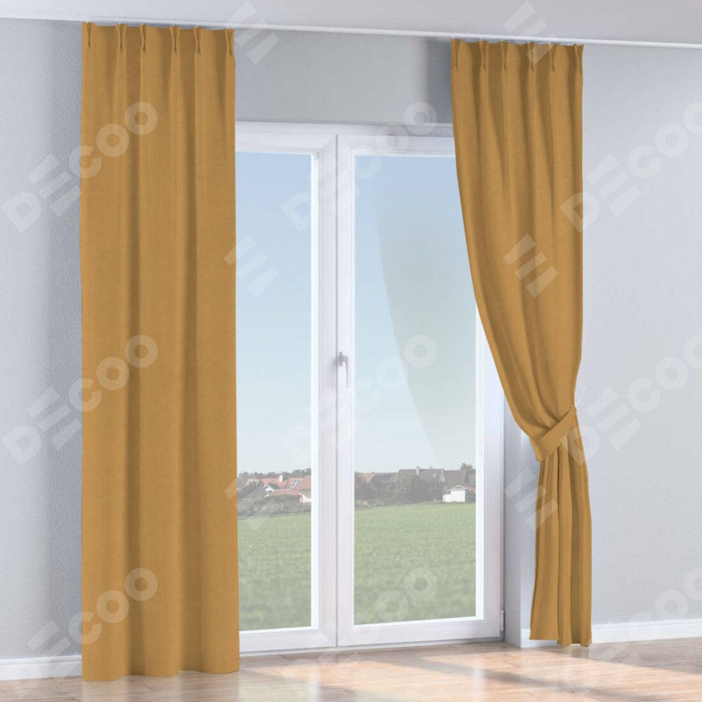 Комплект прямых штор, от производителя «Cortin», пошиты из ткани вельвет горчица, артикул ткани 17760. С изнаночной стороны в верхней части штор пристрачивается шторная лента с декоративными складками «Кустик». Для создания элегантных складок прямые шторы шьются по стандарту с коэффициентом 1:2 (на 100 см. ширины проёма 200 см. ширины ткани).