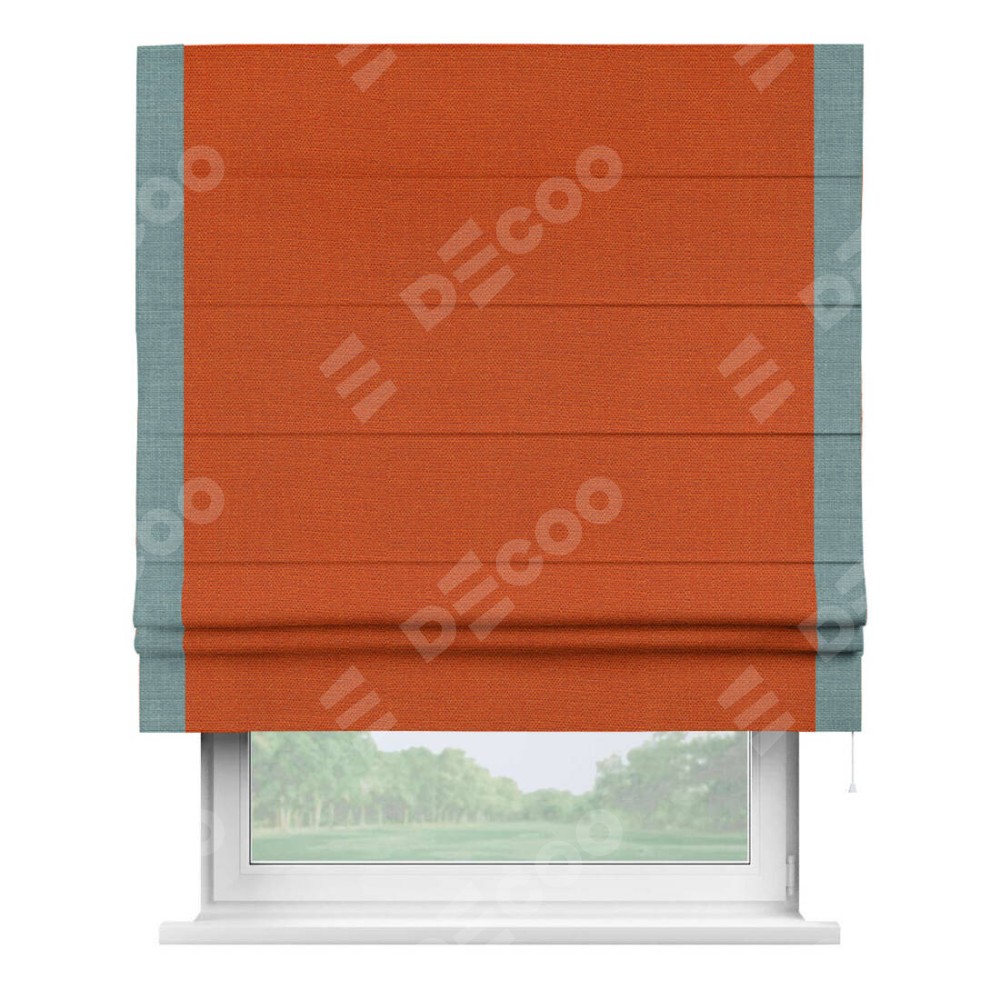 Римская штора производителя «Cortin», используется для проёма, пошита из ткани лён терракотовый, артикул 53440. Отделка шторы кантом «Стрим Дуо», ткань для канта используется из льна разной расцветки на выбор. Имеет универсальный механизм и подходит для монтажа: на потолок, на стену и в нишу.