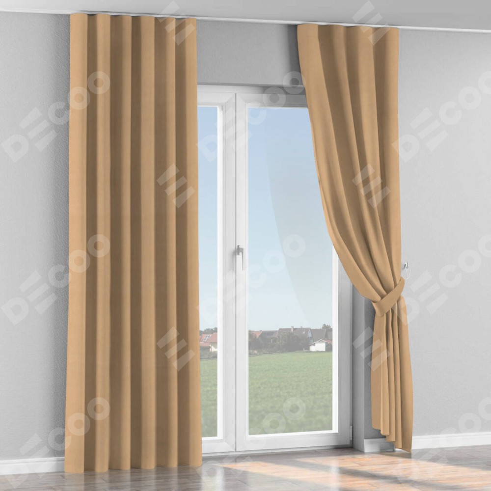 Комплект прямых штор, от производителя «Cortin», пошиты из ткани вельвет песочный, артикул ткани 17740. С изнаночной стороны в верхней части штор пристрачивается шторная лента с декоративными складками «Волна». Для создания элегантных складок прямые шторы шьются по стандарту с коэффициентом 1:2 (на 100 см. ширины проёма 200 см. ширины ткани).