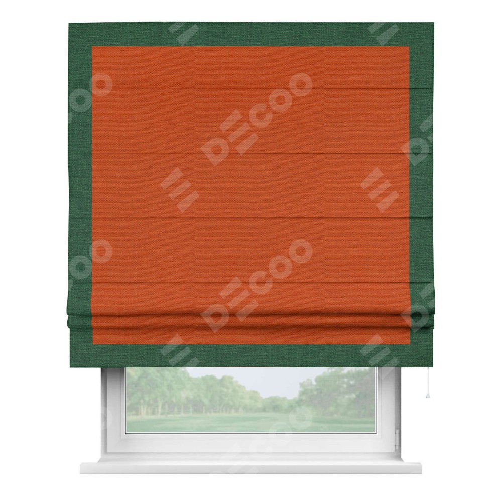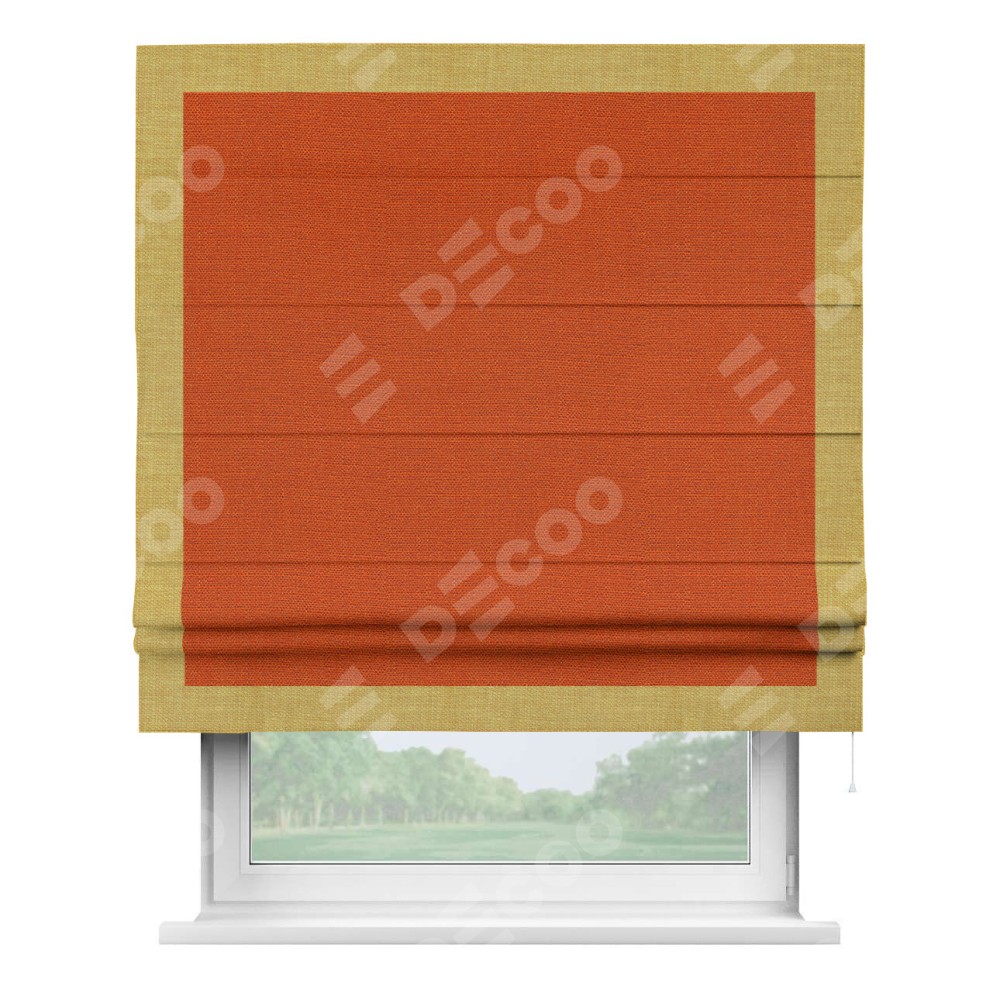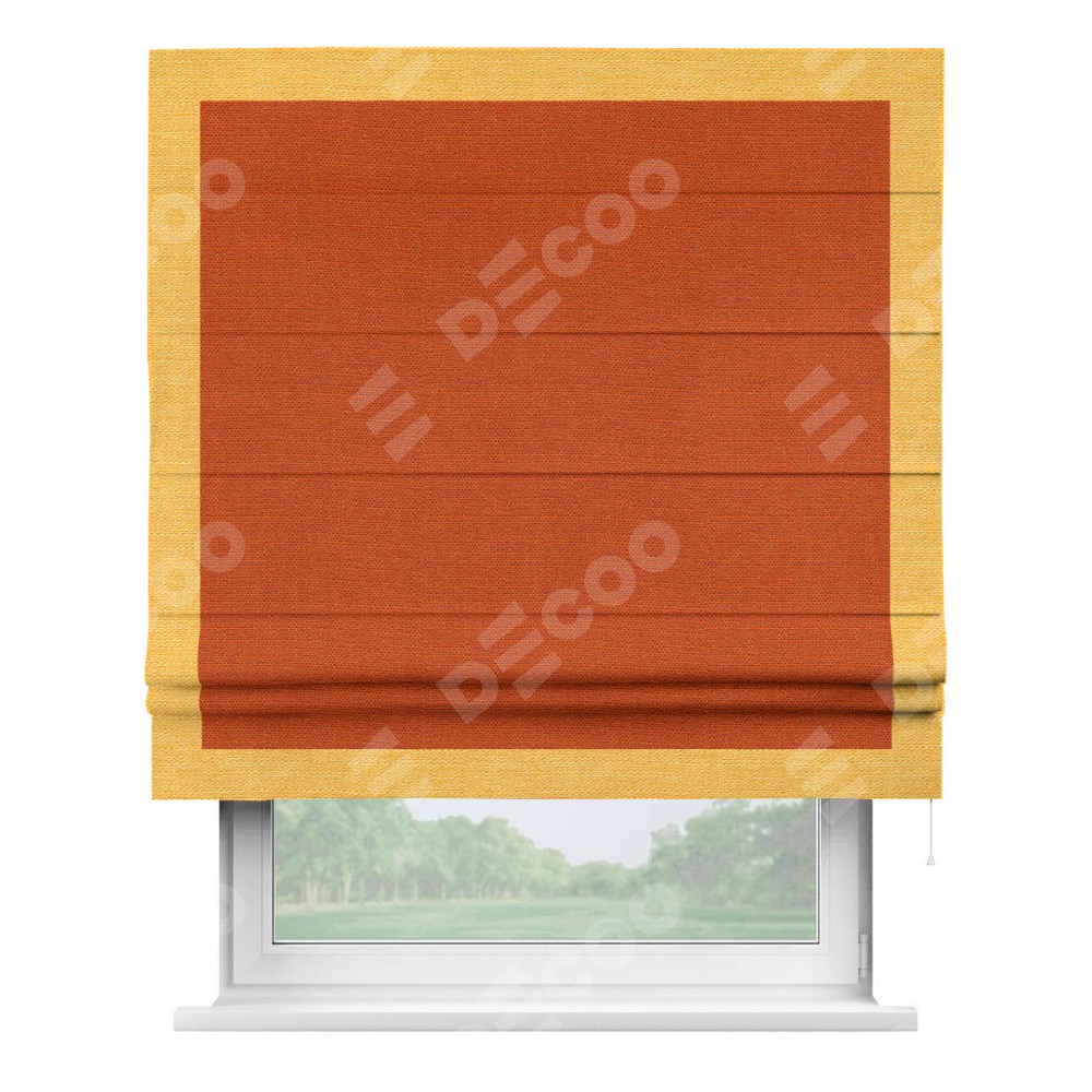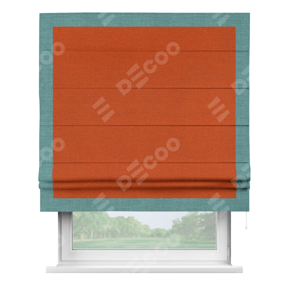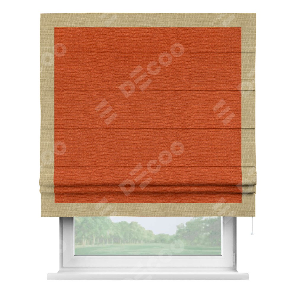 Римская штора производителя «Cortin», используется для проёма, пошита из ткани лён терракотовый, артикул 53440. Отделка шторы кантом «Чесс», ткань для канта используется из льна разной расцветки на выбор. Имеет универсальный механизм и подходит для монтажа: на потолок, на стену и в нишу.