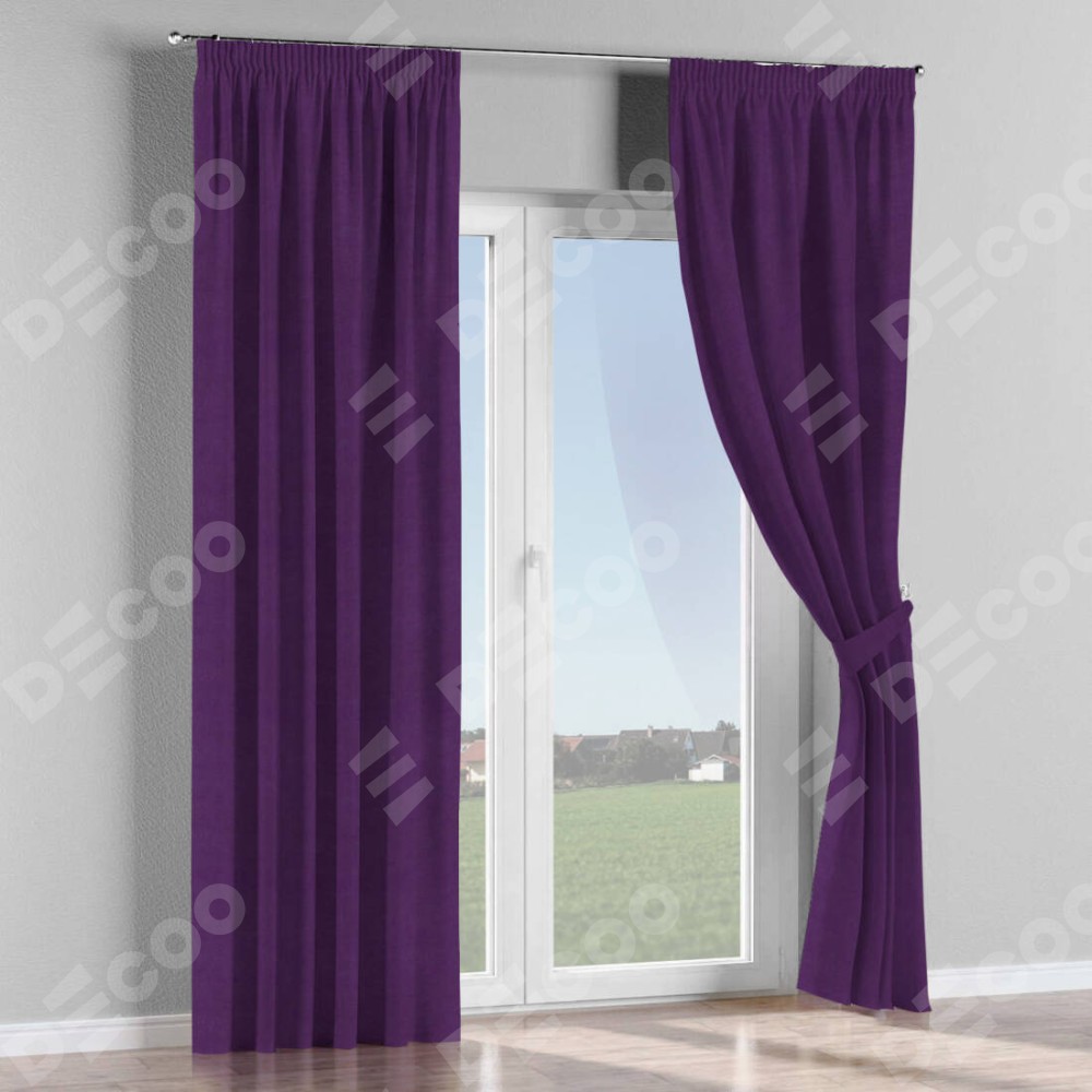 Комплект прямых штор, от производителя «Cortin», пошиты из ткани вельвет тёмно-фиолетовый, артикул ткани 17753. С изнаночной стороны в верхней части штор пристрачивается шторная лента с декоративными складками «Карандаш». Для создания элегантных складок прямые шторы шьются по стандарту с коэффициентом 1:2 (на 100 см. ширины проёма 200 см. ширины ткани).