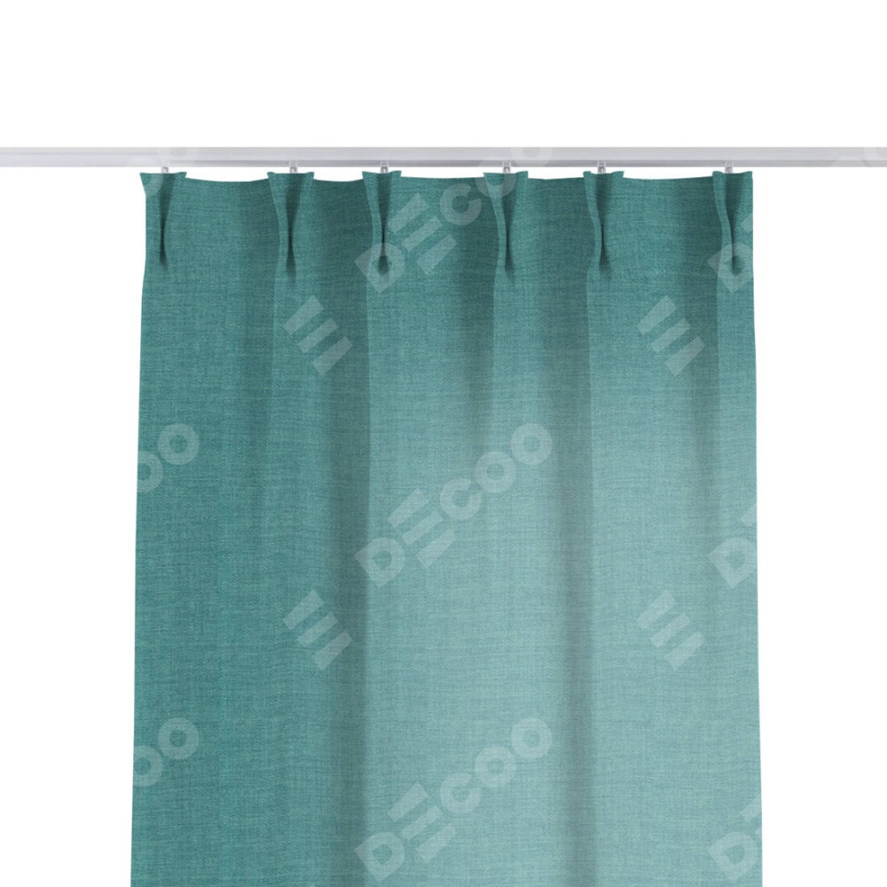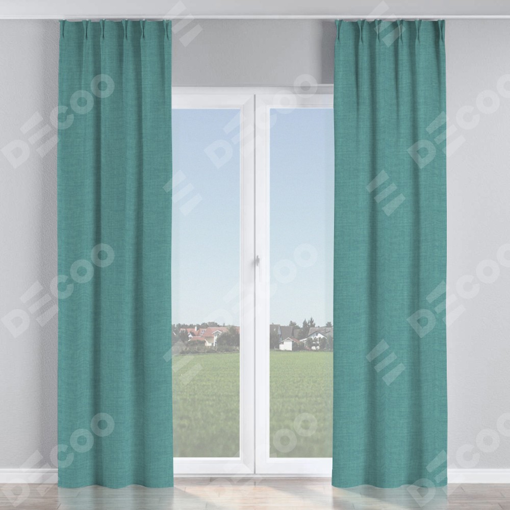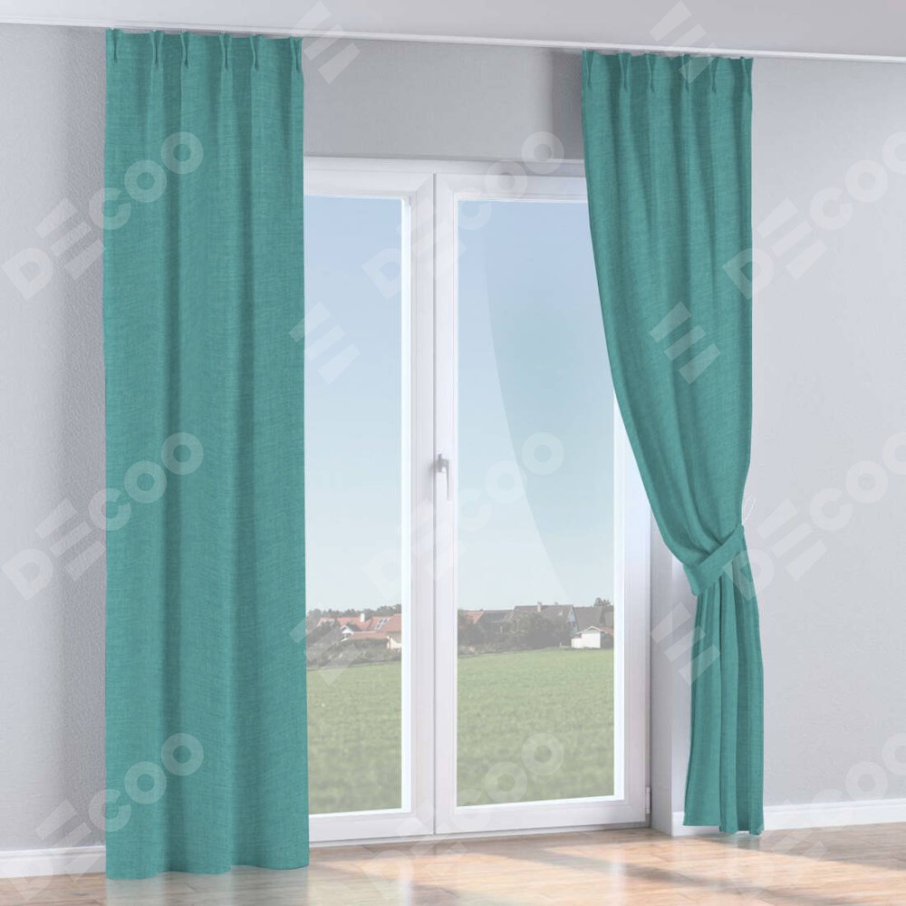 Комплект прямых штор, от производителя «Cortin», пошиты из ткани лён бирюза, артикул ткани 7446. С изнаночной стороны в верхней части штор пристрачивается шторная лента с декоративными складками «Кустик». Для создания элегантных складок прямые шторы шьются по стандарту с коэффициентом 1:2 (на 100 см. ширины проёма 200 см. ширины ткани).