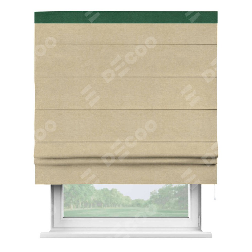 Римская штора производителя «Cortin», используется для проёма, пошита из ткани вельвет бежевый, артикул ткани 85538. Отделка шторы кантом «Кинг», ткань для канта используется из вельвета разной расцветки на выбор. Имеет универсальный механизм и подходит для монтажа: на потолок, на стену и в нишу.