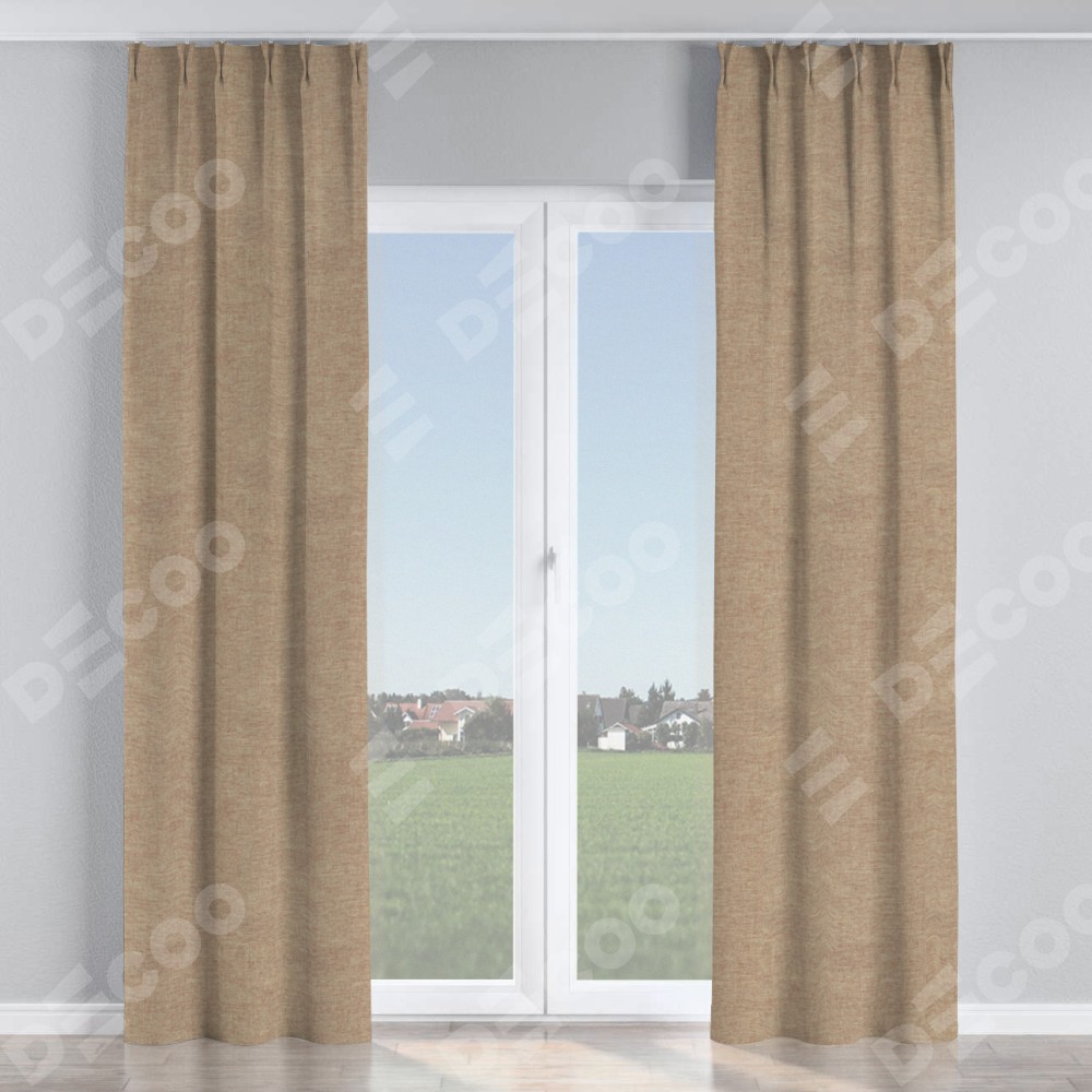 Комплект прямых штор, от производителя «Cortin», пошиты из ткани лён кашемир коричневый, артикул ткани 21614. С изнаночной стороны в верхней части штор пристрачивается шторная лента с декоративными складками «Кустик». Для создания элегантных складок прямые шторы шьются по стандарту с коэффициентом 1:2 (на 100 см. ширины проёма 200 см. ширины ткани).