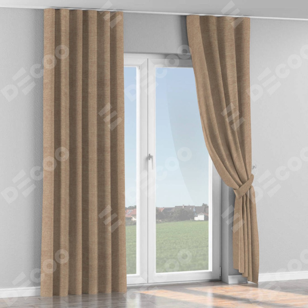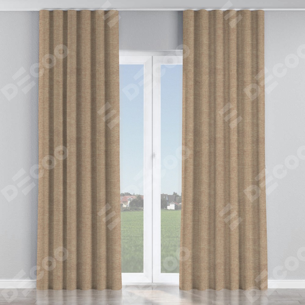 Комплект прямых штор, от производителя «Cortin», пошиты из ткани лён кашемир коричневый, артикул ткани 21614. С изнаночной стороны в верхней части штор пристрачивается шторная лента с декоративными складками «Волна». Для создания элегантных складок прямые шторы шьются по стандарту с коэффициентом 1:2 (на 100 см. ширины проёма 200 см. ширины ткани).