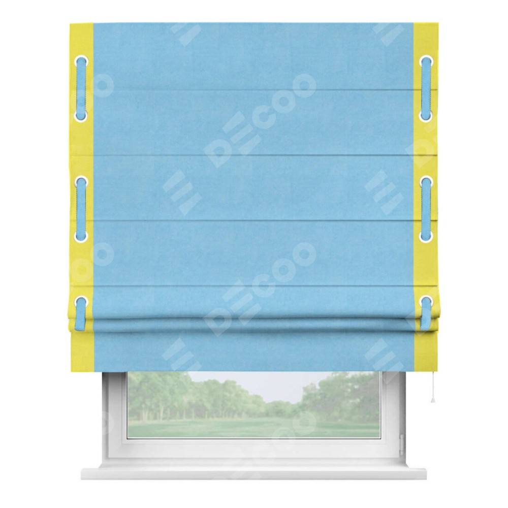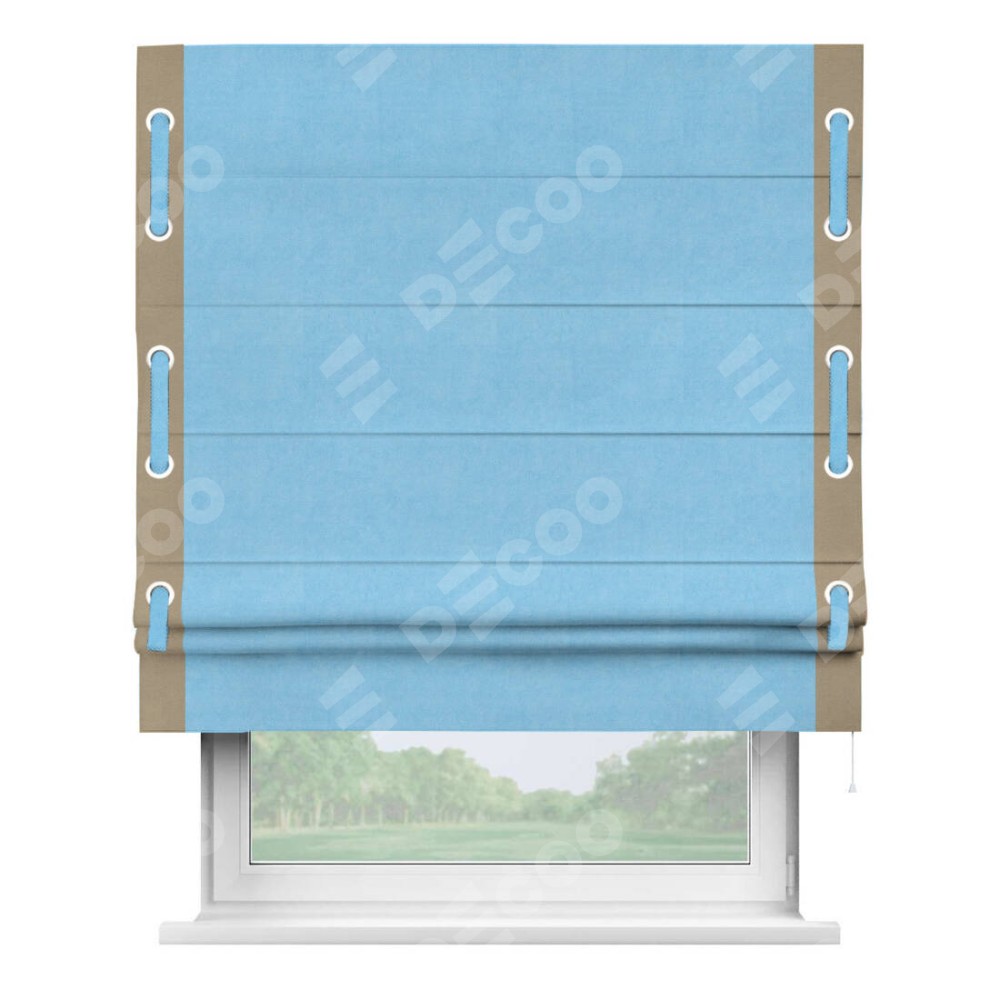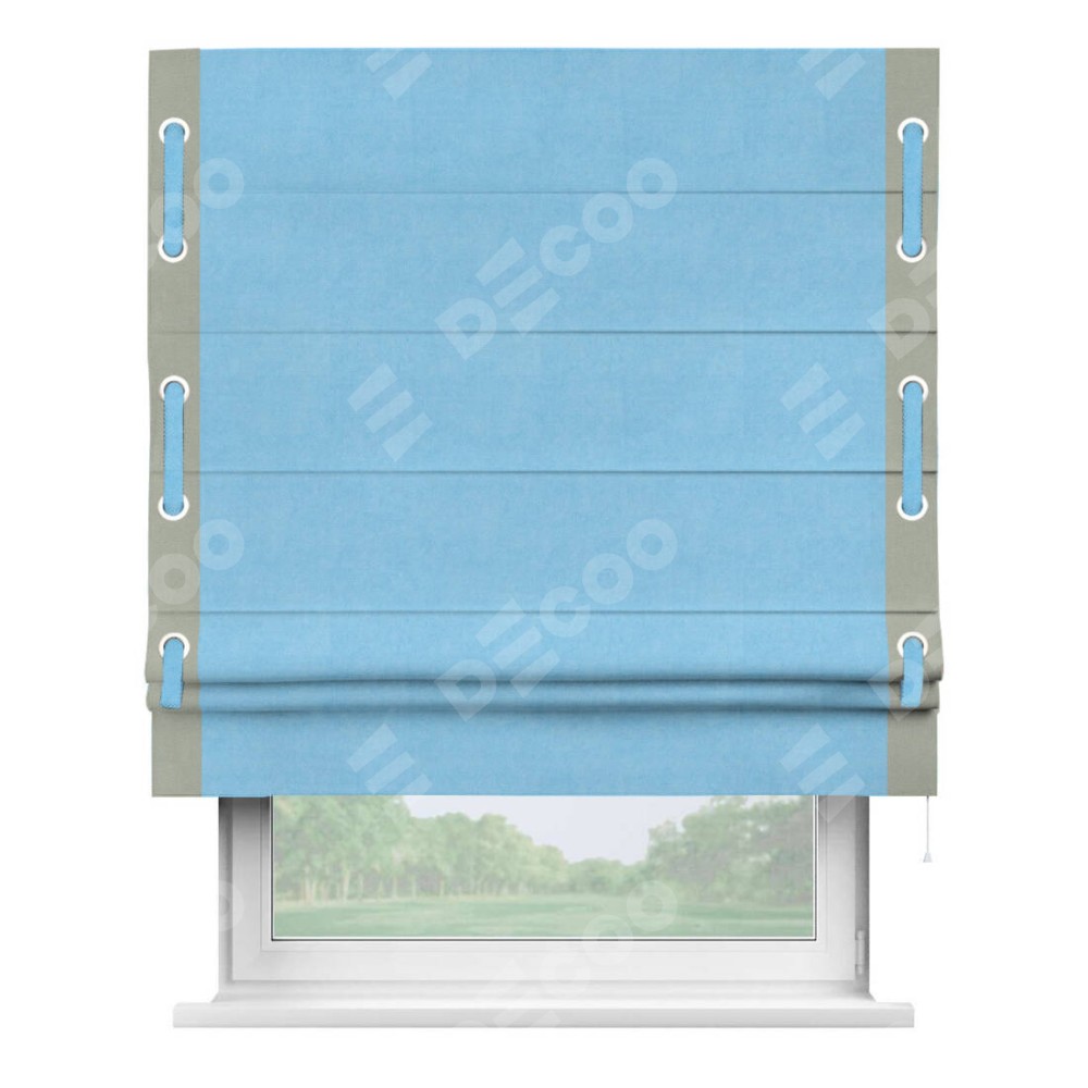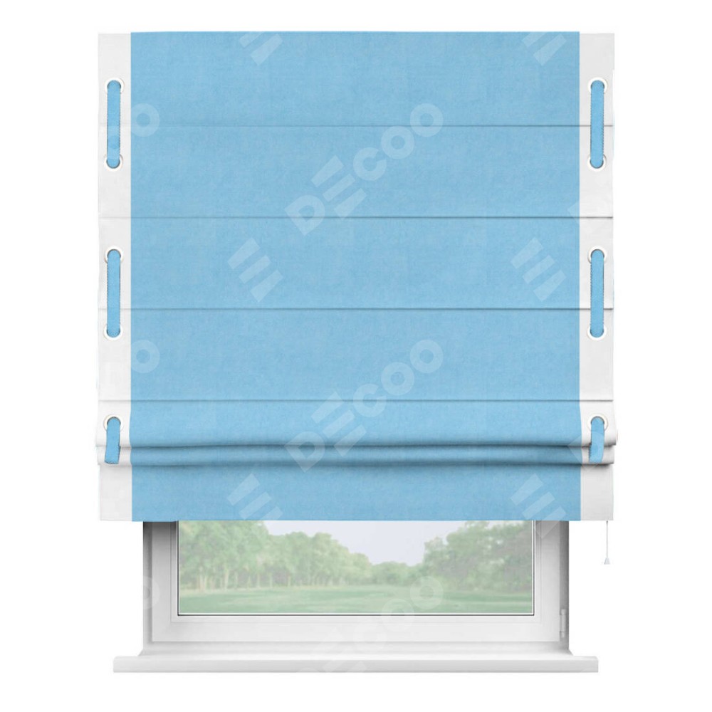 Римская штора производителя «Cortin», используется для проёма, пошита из ткани вельвет голубой, артикул ткани 85544. Отделка шторы кантом «Стрим Дуо» на кантах расположены люверсы с пояском, ткань для канта используется из вельвета разной расцветки на выбор. Ткань для пояска обычно используется из основной ткани шторы, а так же можно сделать из любой расцветки по желанию. Имеет универсальный механизм и подходит для монтажа: на потолок, на стену и в нишу.