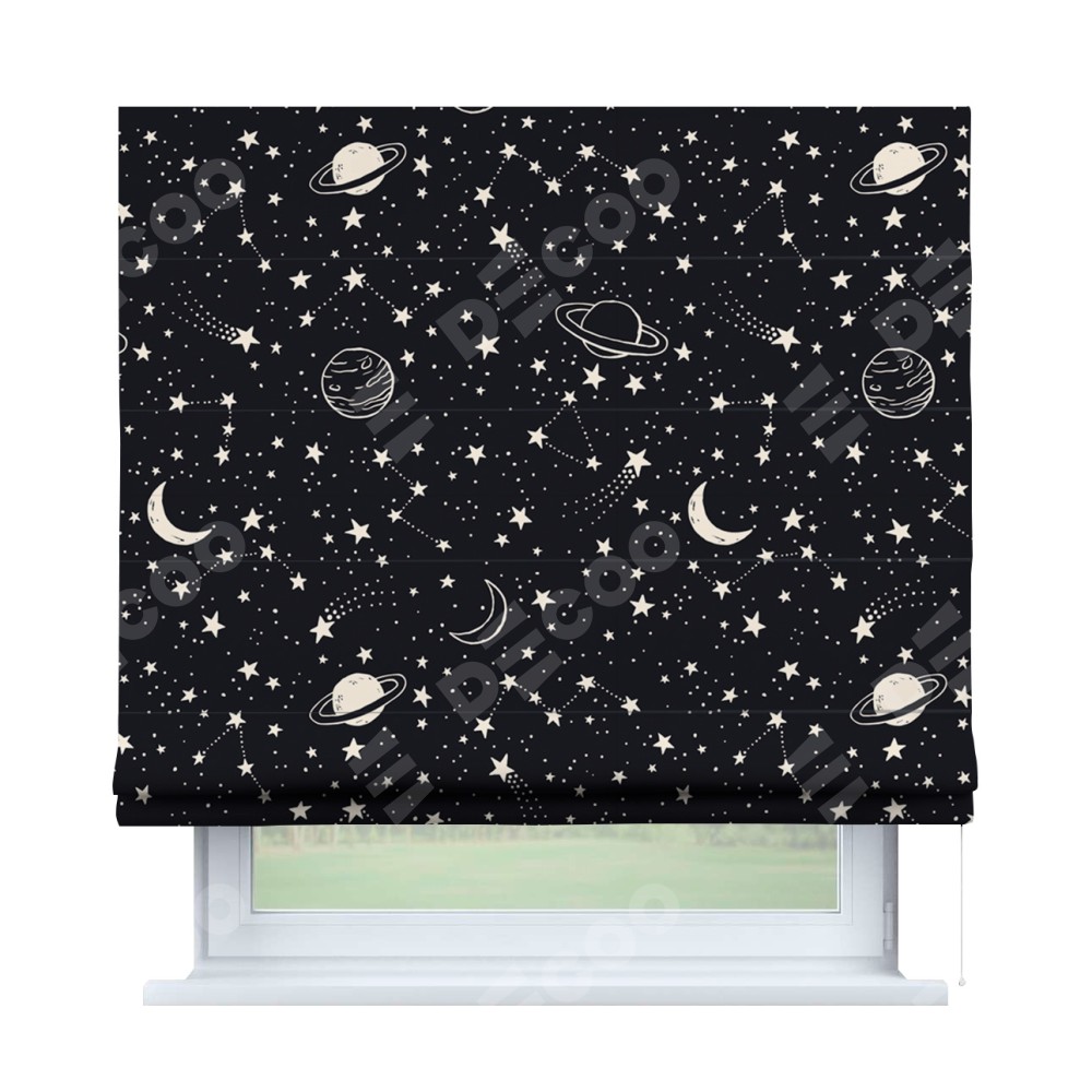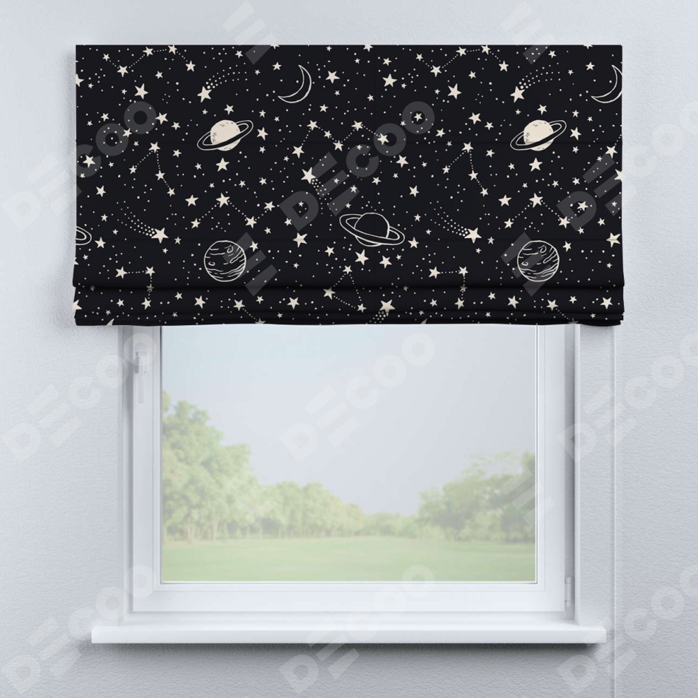 Римская штора производителя «Cortin», используется для проёма, пошита из ткани блэкаут с нанесением сублимационной печати «Глубокий космос». Имеет универсальный механизм и подходит для монтажа: на потолок, на стену и в нишу.