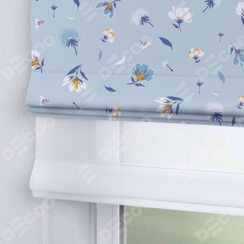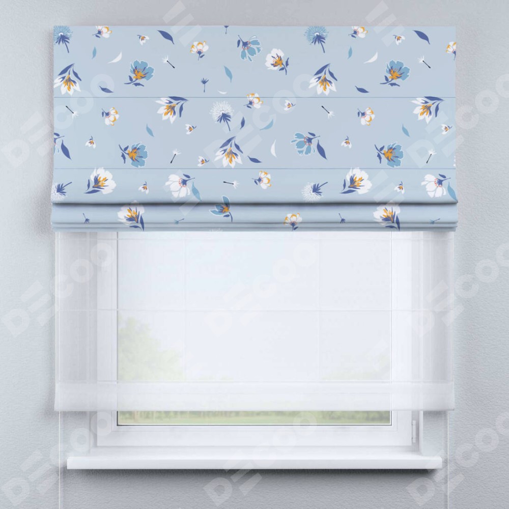 Римская штора день-ночь производителя «Cortin», используется для проёма, пошита из двух полотен, с лицевой блэкаут с нанесением сублимационной печати «Голубые цветы», вторая ткань тюль (по стандарту комплектуется тюль белого цвета артикул V-01). Имеет универсальный механизм и подходит для монтажа: на потолок, на стену и в нишу.
