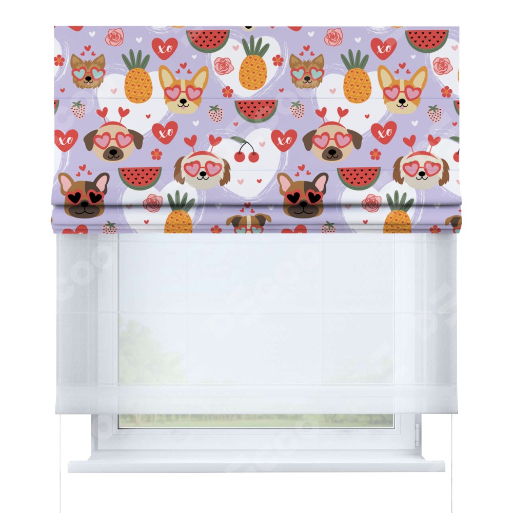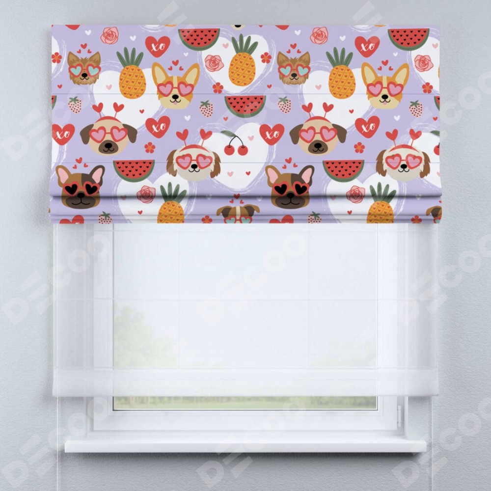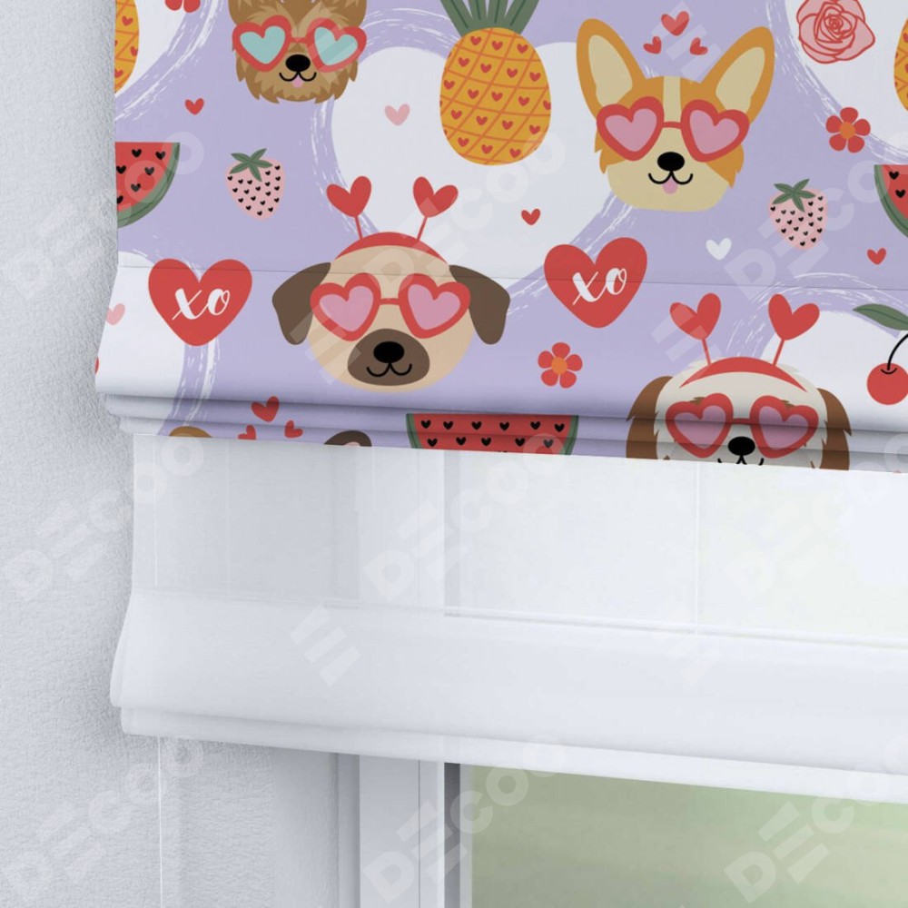 Римская штора день-ночь производителя «Cortin», используется для проёма, пошита из двух полотен, с лицевой блэкаут с нанесением сублимационной печати «Забавные собачки», вторая ткань тюль (по стандарту комплектуется тюль белого цвета артикул V-01). Имеет универсальный механизм и подходит для монтажа: на потолок, на стену и в нишу.