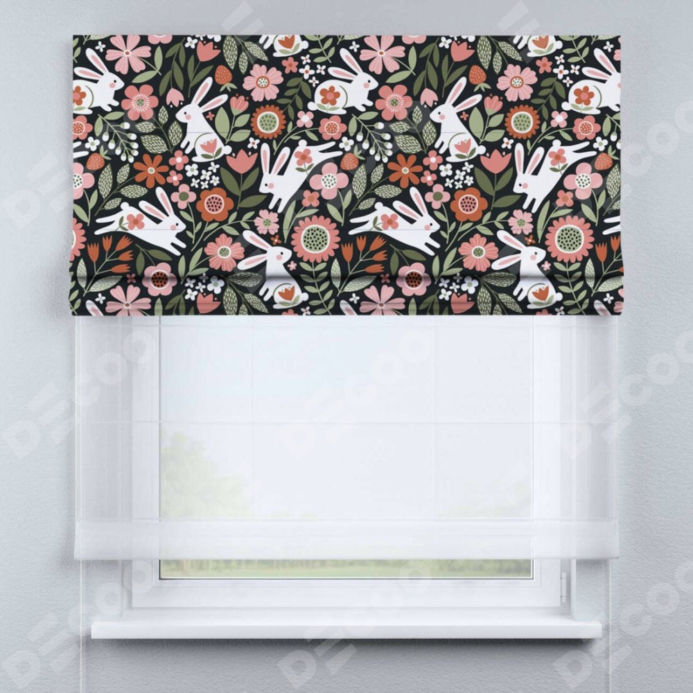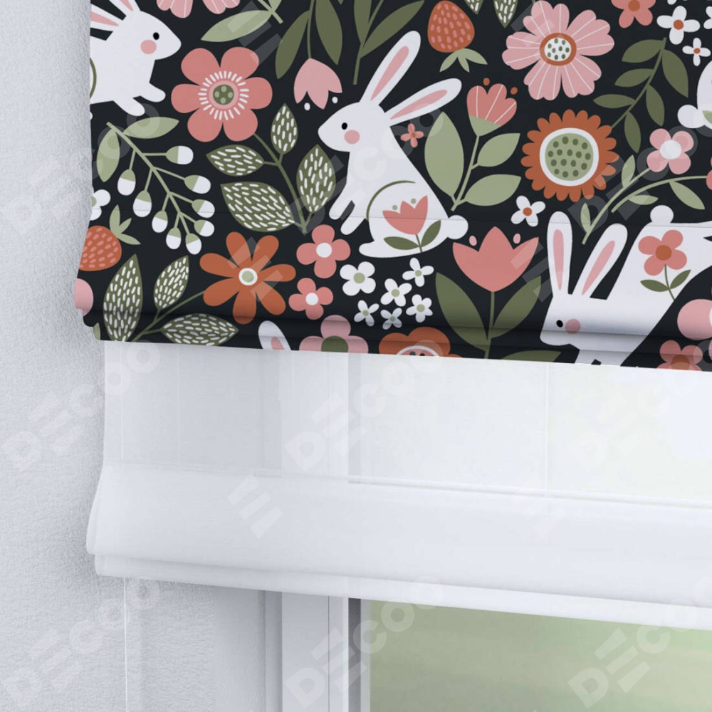 Римская штора день-ночь производителя «Cortin», используется для проёма, пошита из двух полотен, с лицевой блэкаут с нанесением сублимационной печати «Зайчики в цветнике», вторая ткань тюль (по стандарту комплектуется тюль белого цвета артикул V-01). Имеет универсальный механизм и подходит для монтажа: на потолок, на стену и в нишу.