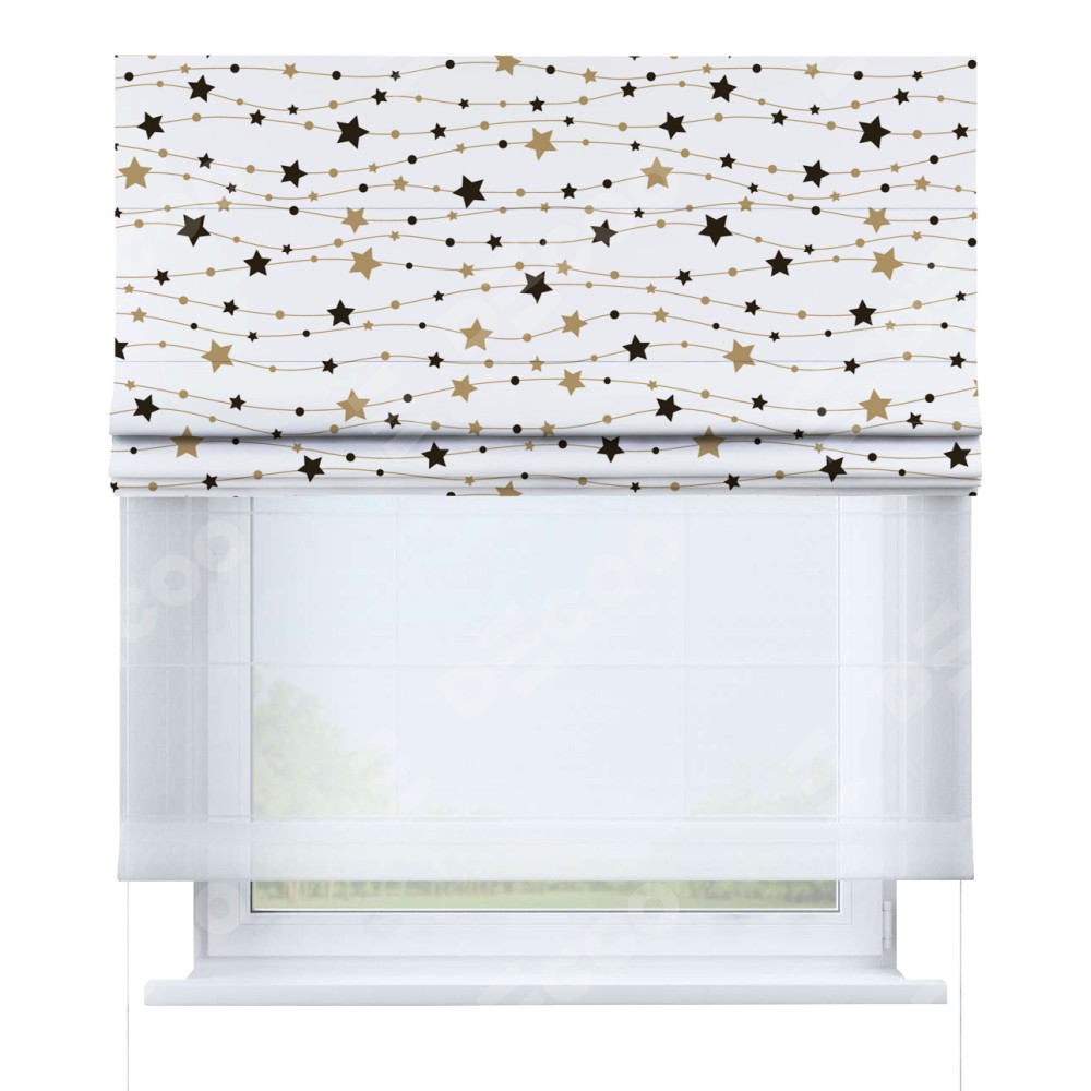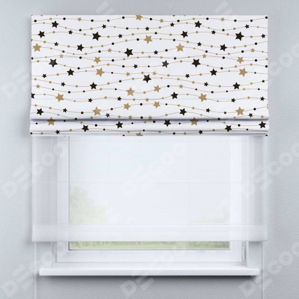 Римская штора день-ночь производителя «Cortin», используется для проёма, пошита из двух полотен, с лицевой блэкаут с нанесением сублимационной печати «Звёздная нить», вторая ткань тюль (по стандарту комплектуется тюль белого цвета артикул V-01). Имеет универсальный механизм и подходит для монтажа: на потолок, на стену и в нишу.