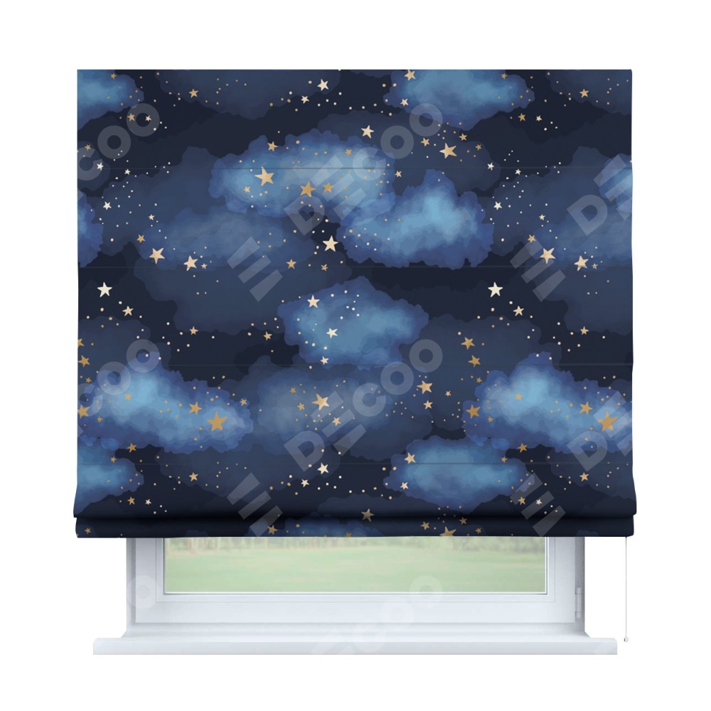 Римская штора производителя «Cortin», используется для проёма, пошита из ткани блэкаут с нанесением сублимационной печати «Золотые звёзды». Имеет универсальный механизм и подходит для монтажа: на потолок, на стену и в нишу.