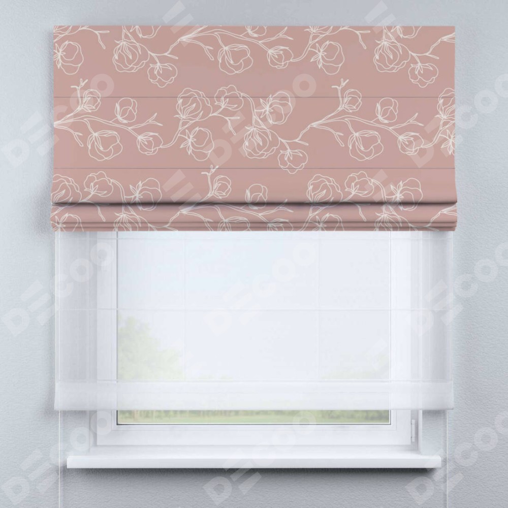 Римская штора день-ночь производителя «Cortin», используется для проёма, пошита из двух полотен, с лицевой блэкаут с нанесением сублимационной печати «Нежные цветы», вторая ткань тюль (по стандарту комплектуется тюль белого цвета артикул V-01). Имеет универсальный механизм и подходит для монтажа: на потолок, на стену и в нишу.