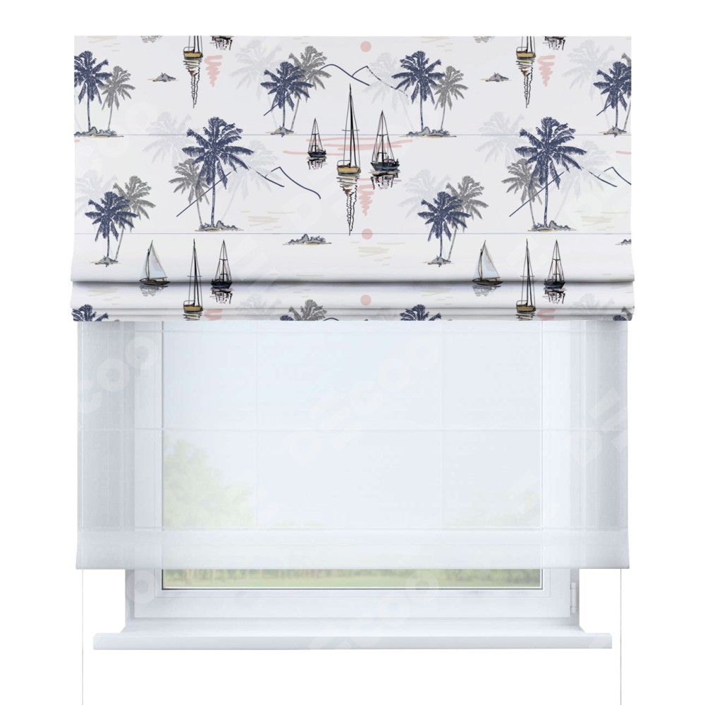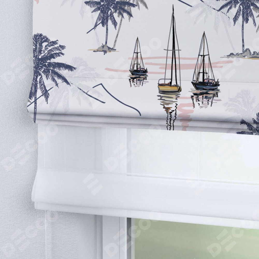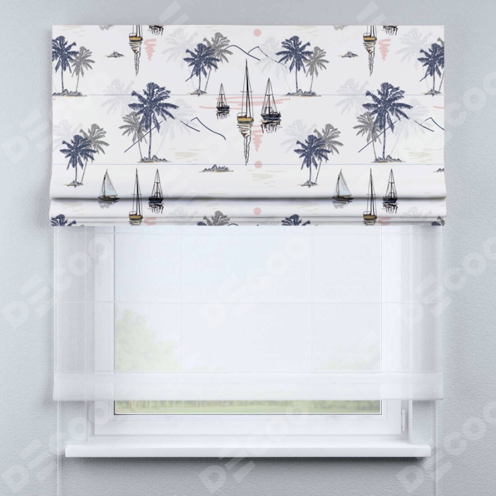 Римская штора день-ночь производителя «Cortin», используется для проёма, пошита из двух полотен, с лицевой блэкаут с нанесением сублимационной печати «Морское путешествие», вторая ткань тюль (по стандарту комплектуется тюль белого цвета артикул V-01). Имеет универсальный механизм и подходит для монтажа: на потолок, на стену и в нишу.