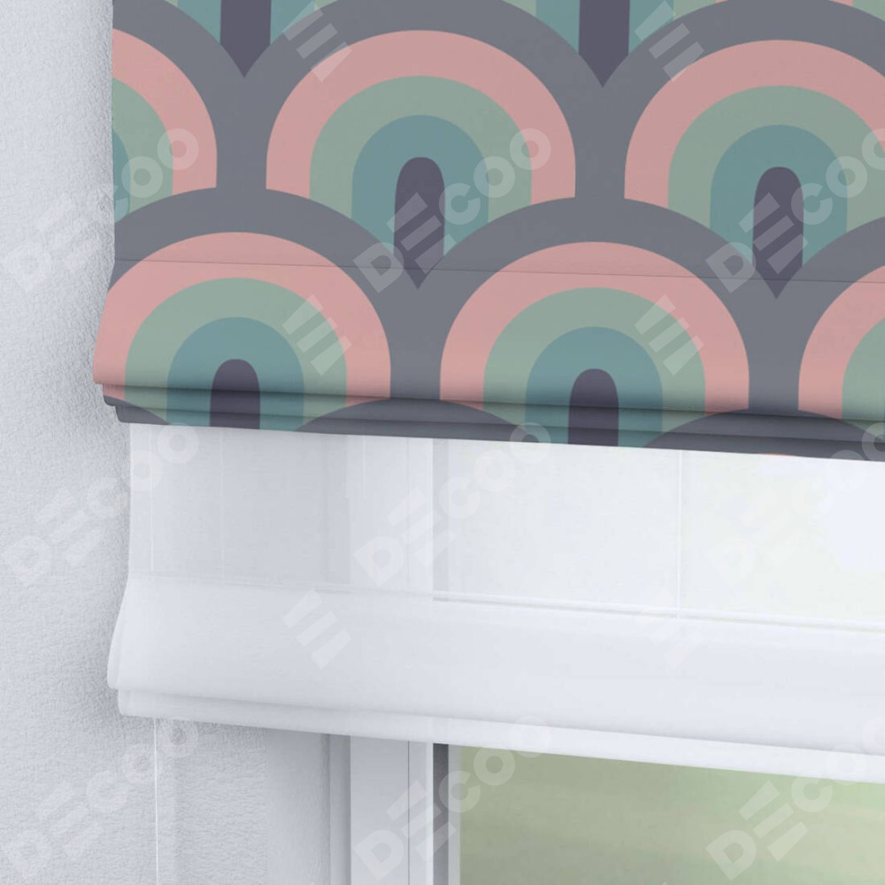 Римская штора день-ночь производителя «Cortin», используется для проёма, пошита из двух полотен, с лицевой блэкаут с нанесением сублимационной печати «Ретро орнамент», вторая ткань тюль (по стандарту комплектуется тюль белого цвета артикул V-01). Имеет универсальный механизм и подходит для монтажа: на потолок, на стену и в нишу.