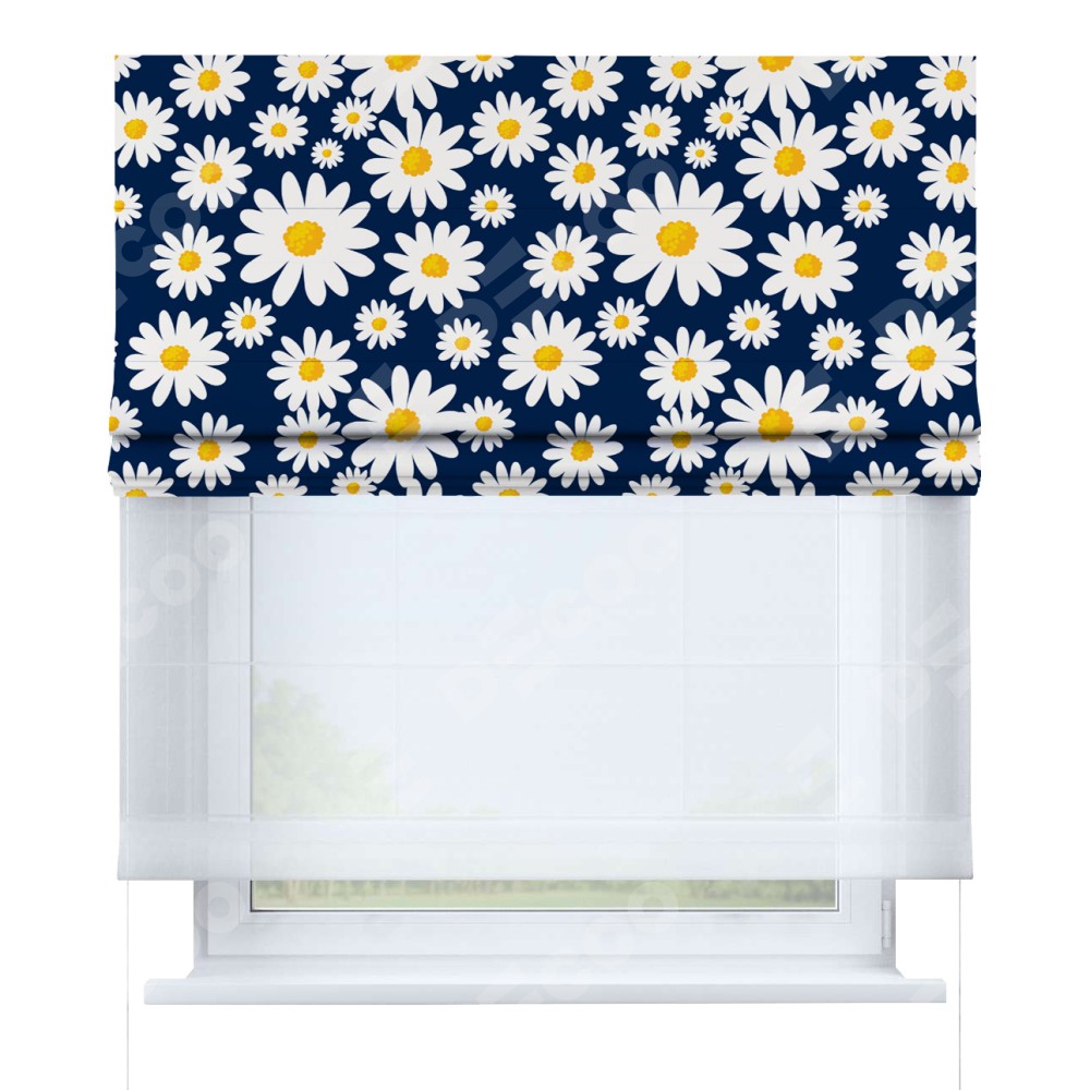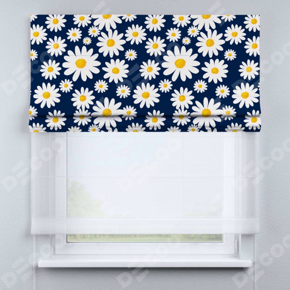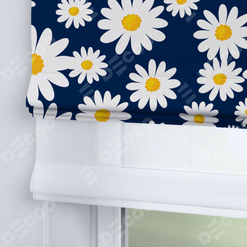 Римская штора день-ночь производителя «Cortin», используется для проёма, пошита из двух полотен, с лицевой блэкаут с нанесением сублимационной печати «Яркие ромашки», вторая ткань тюль (по стандарту комплектуется тюль белого цвета артикул V-01). Имеет универсальный механизм и подходит для монтажа: на потолок, на стену и в нишу.