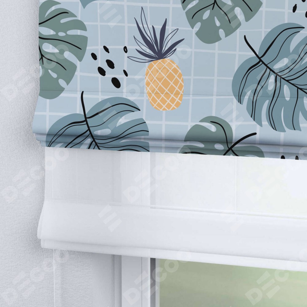 Римская штора день-ночь производителя «Cortin», используется для проёма, пошита из двух полотен, с лицевой блэкаут с нанесением сублимационной печати «Ананасы и листья монстеры», вторая ткань тюль (по стандарту комплектуется тюль белого цвета артикул V-01). Имеет универсальный механизм и подходит для монтажа: на потолок, на стену и в нишу.
