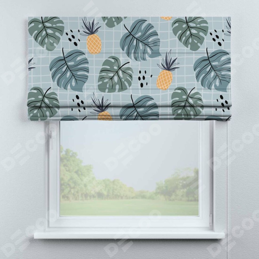 Римская штора производителя «Cortin», используется для проёма, пошита из ткани блэкаут с нанесением сублимационной печати «Ананасы и листья монстеры». Имеет универсальный механизм и подходит для монтажа: на потолок, на стену и в нишу.