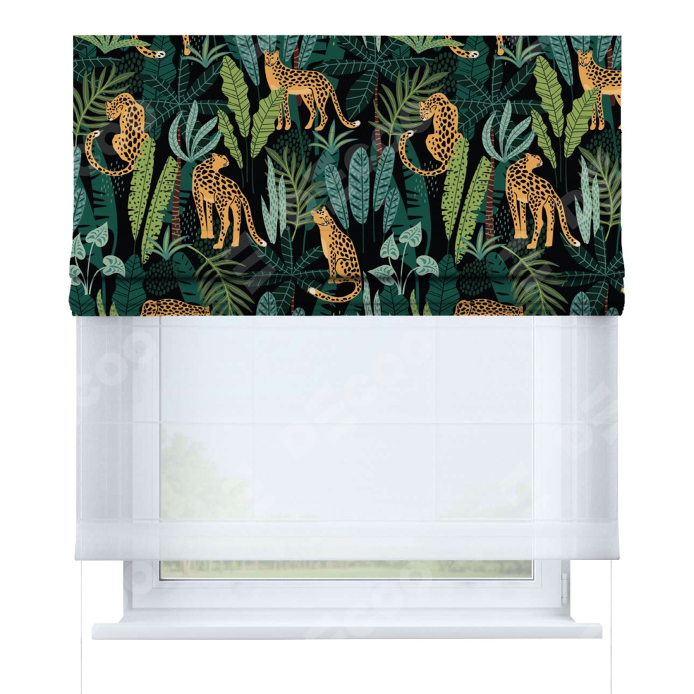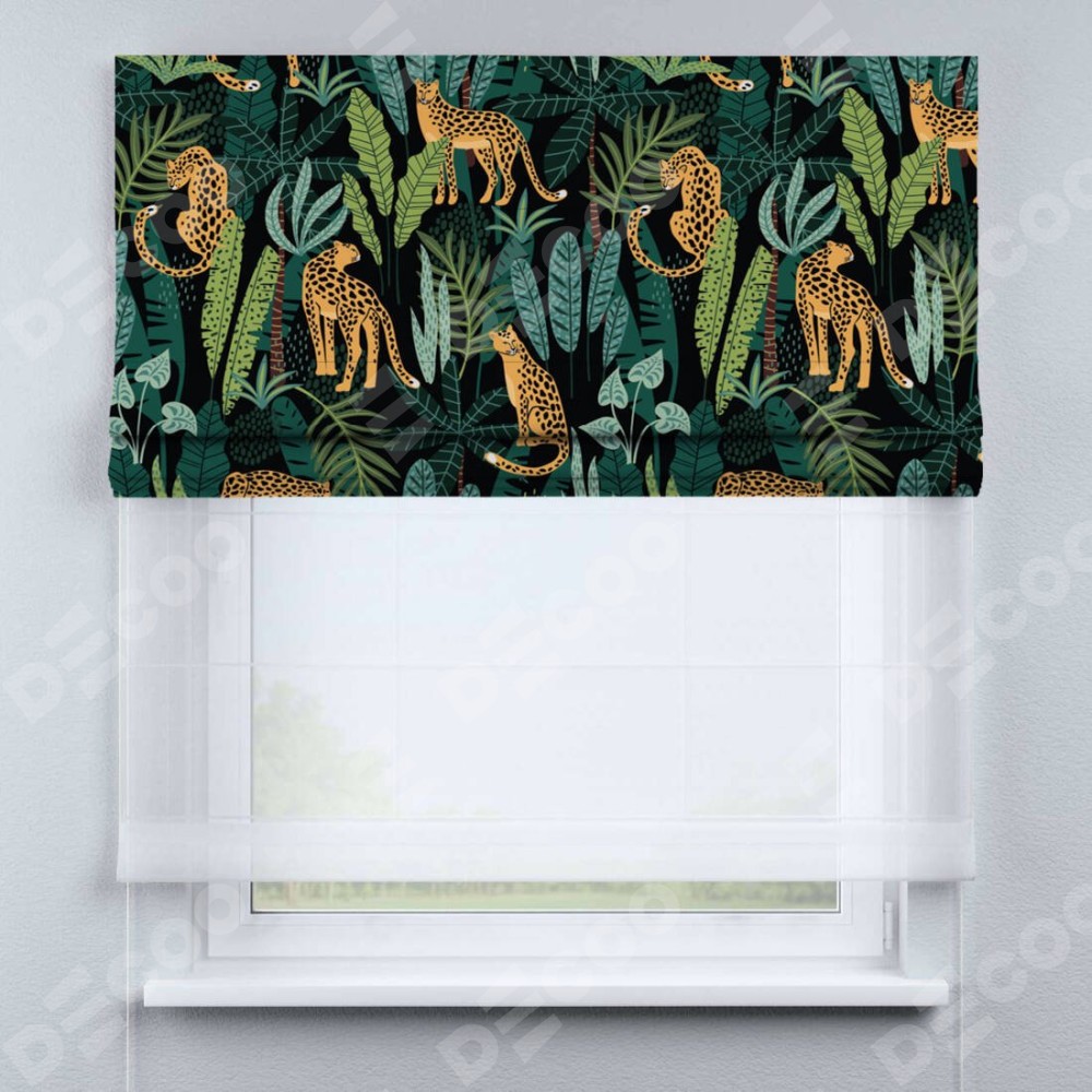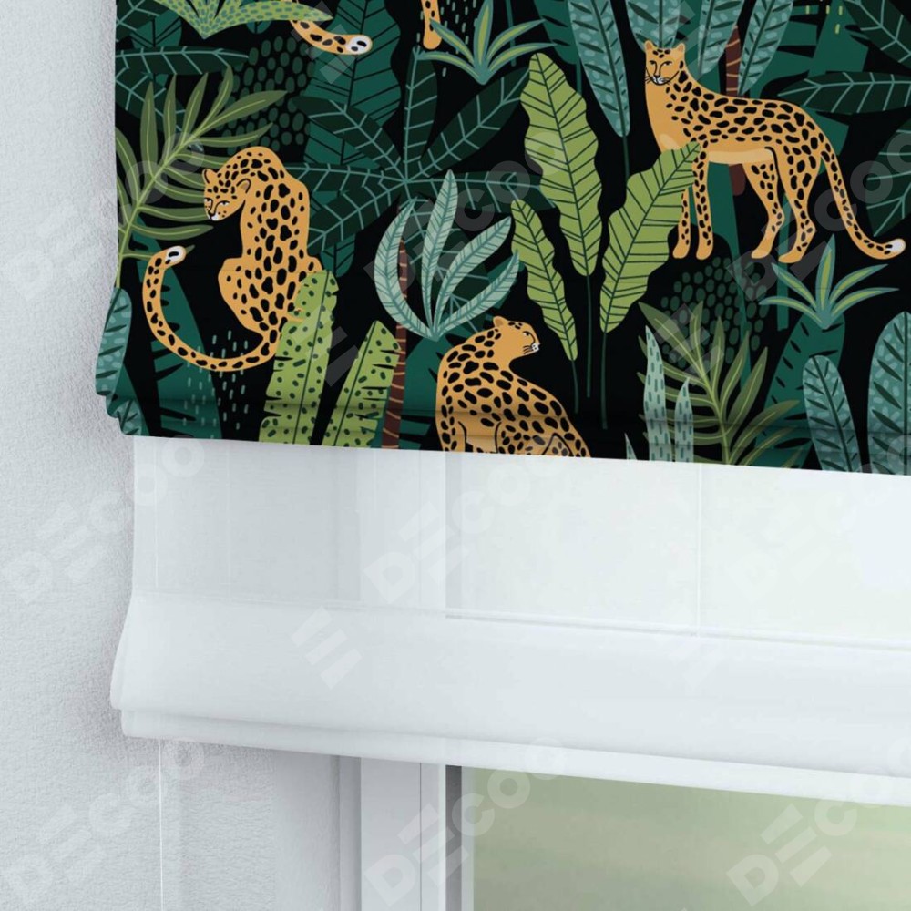 Римская штора день-ночь производителя «Cortin», используется для проёма, пошита из двух полотен, с лицевой блэкаут с нанесением сублимационной печати «Леопарды в джунглях», вторая ткань тюль (по стандарту комплектуется тюль белого цвета артикул V-01). Имеет универсальный механизм и подходит для монтажа: на потолок, на стену и в нишу.