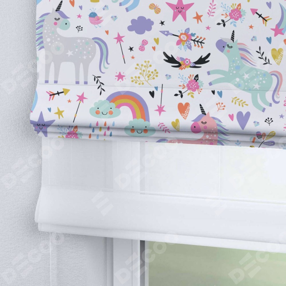 Римская штора день-ночь производителя «Cortin», используется для проёма, пошита из двух полотен, с лицевой блэкаут с нанесением сублимационной печати «Радужные единороги», вторая ткань тюль (по стандарту комплектуется тюль белого цвета артикул V-01). Имеет универсальный механизм и подходит для монтажа: на потолок, на стену и в нишу.
