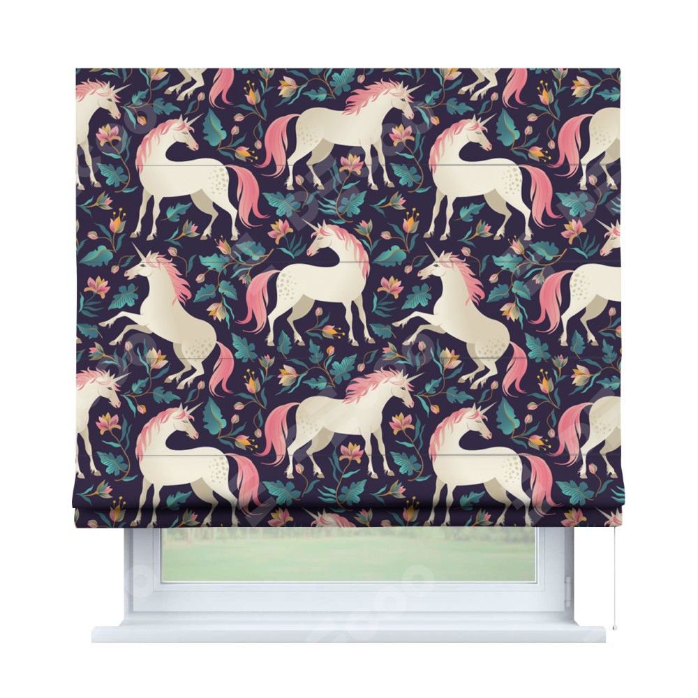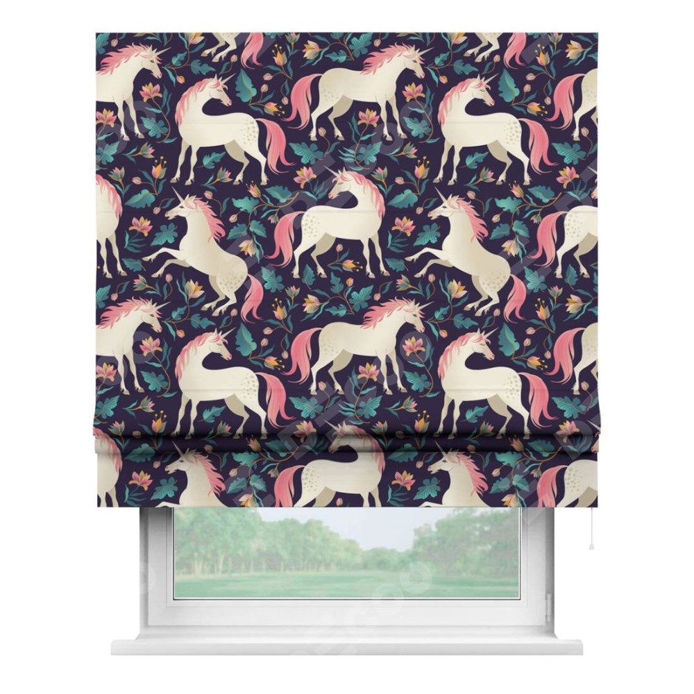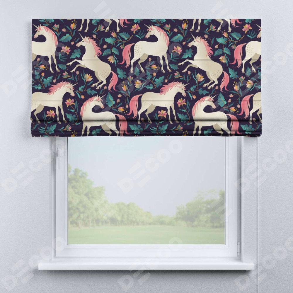 Римская штора производителя «Cortin», используется для проёма, пошита из ткани блэкаут с нанесением сублимационной печати «Сказочные единороги». Имеет универсальный механизм и подходит для монтажа: на потолок, на стену и в нишу.