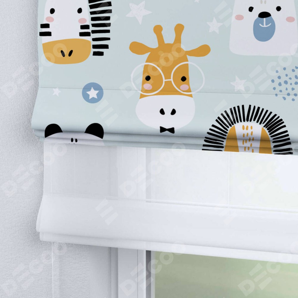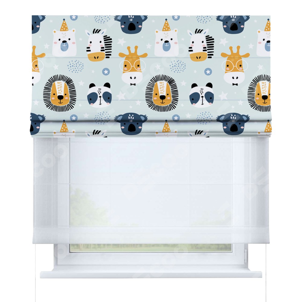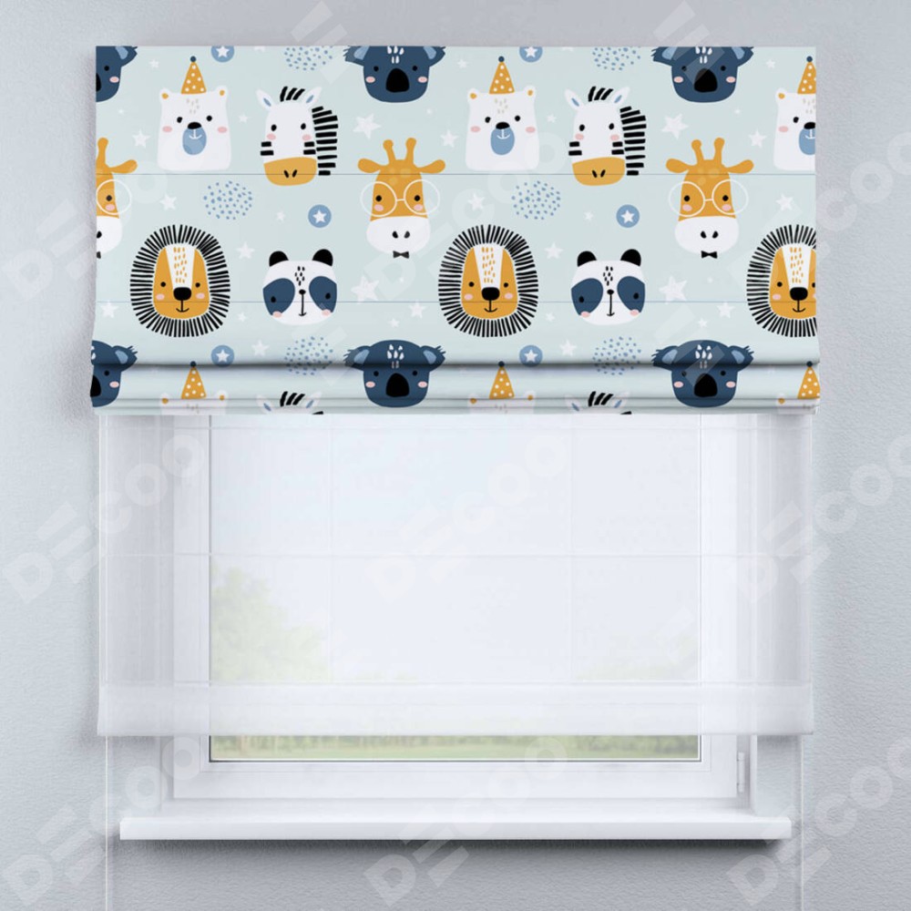 Римская штора день-ночь производителя «Cortin», используется для проёма, пошита из двух полотен, с лицевой блэкаут с нанесением сублимационной печати «Чудесный зоопарк», вторая ткань тюль (по стандарту комплектуется тюль белого цвета артикул V-01). Имеет универсальный механизм и подходит для монтажа: на потолок, на стену и в нишу.