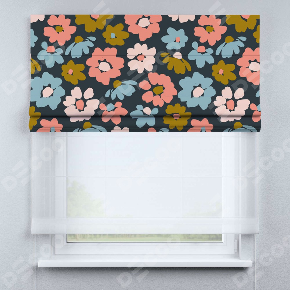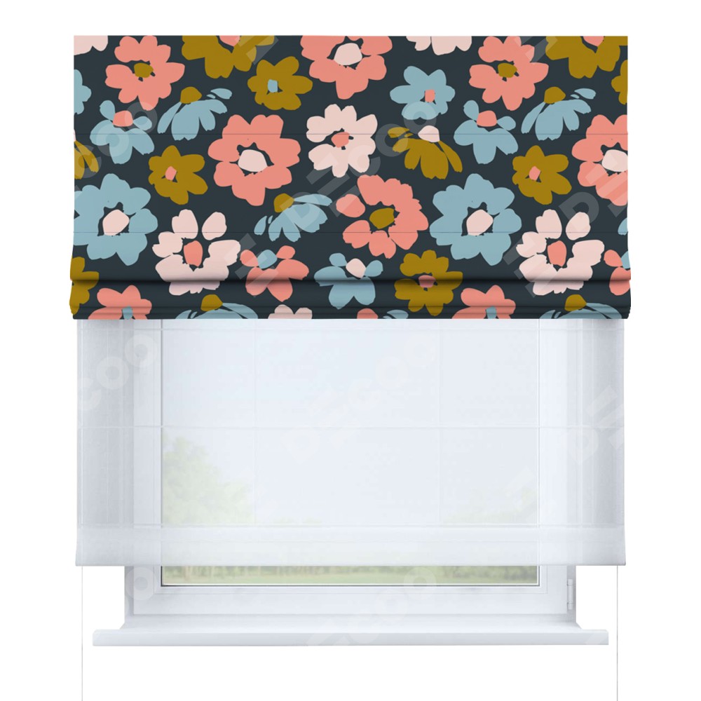 Римская штора день-ночь производителя «Cortin», используется для проёма, пошита из двух полотен, с лицевой блэкаут с нанесением сублимационной печати «Яркие цветы», вторая ткань тюль (по стандарту комплектуется тюль белого цвета артикул V-01). Имеет универсальный механизм и подходит для монтажа: на потолок, на стену и в нишу.
