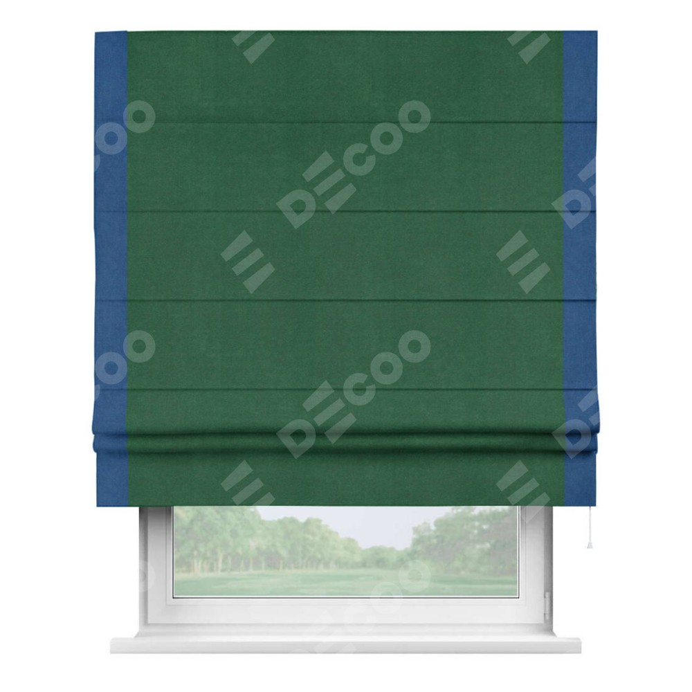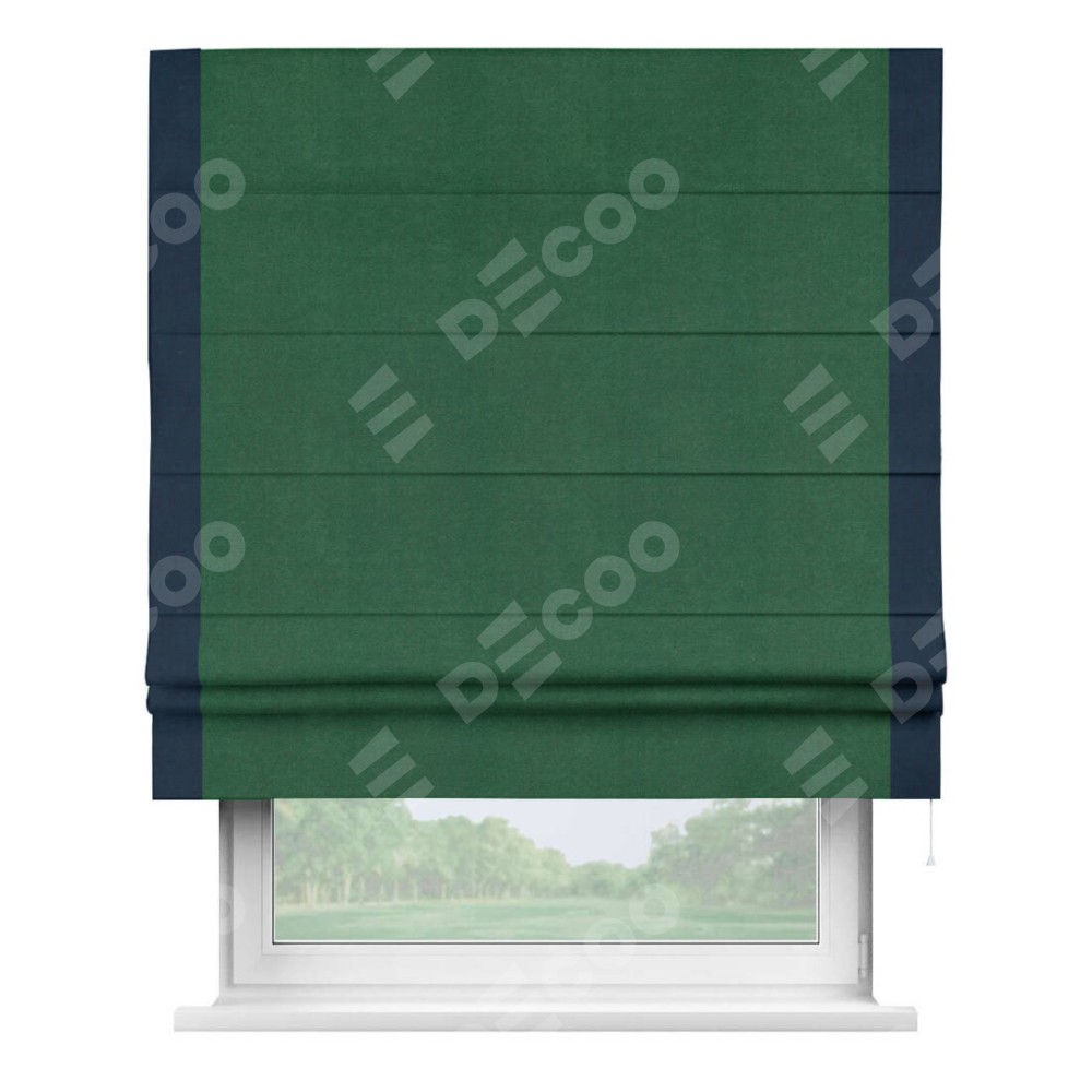 Римская штора производителя «Cortin», используется для проёма, пошита из ткани вельвет зеленый, артикул ткани 85546. Отделка шторы кантом «Стрим Дуо», ткань для канта используется из вельвета разной расцветки на выбор. Имеет универсальный механизм и подходит для монтажа: на потолок, на стену и в нишу.