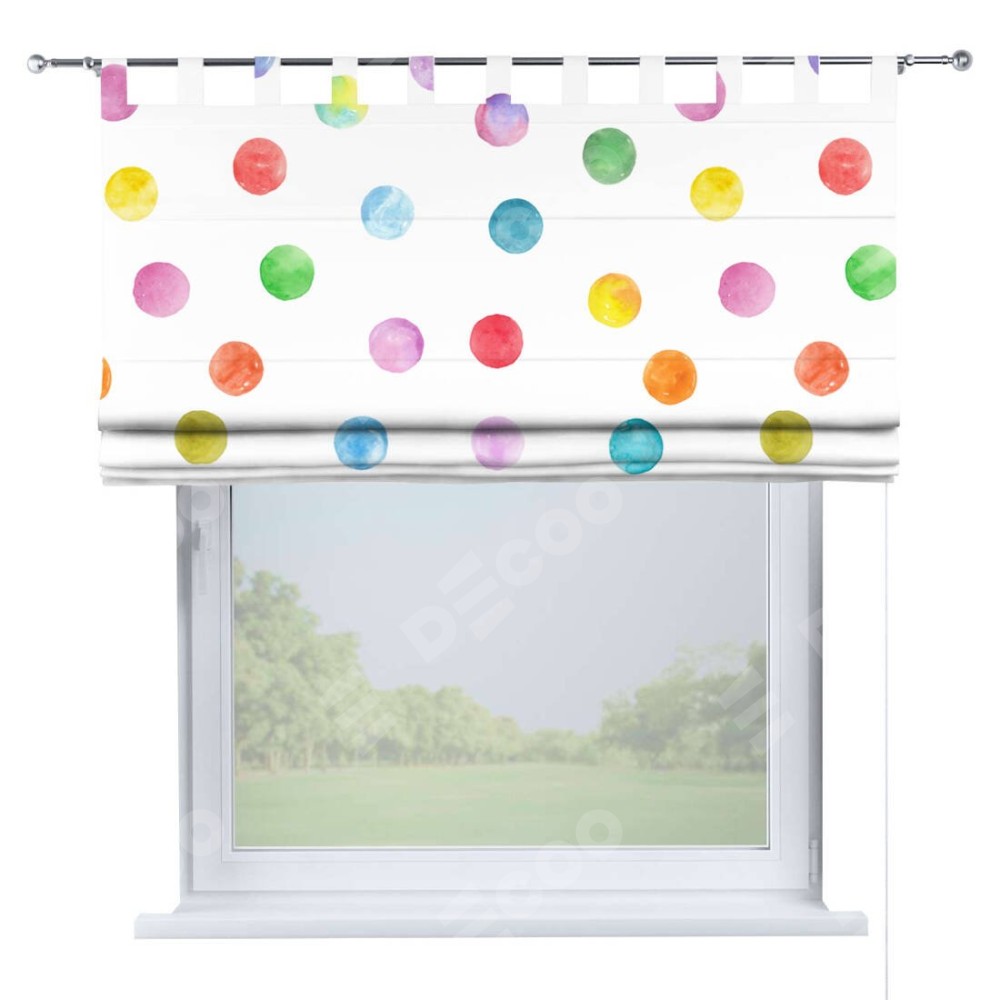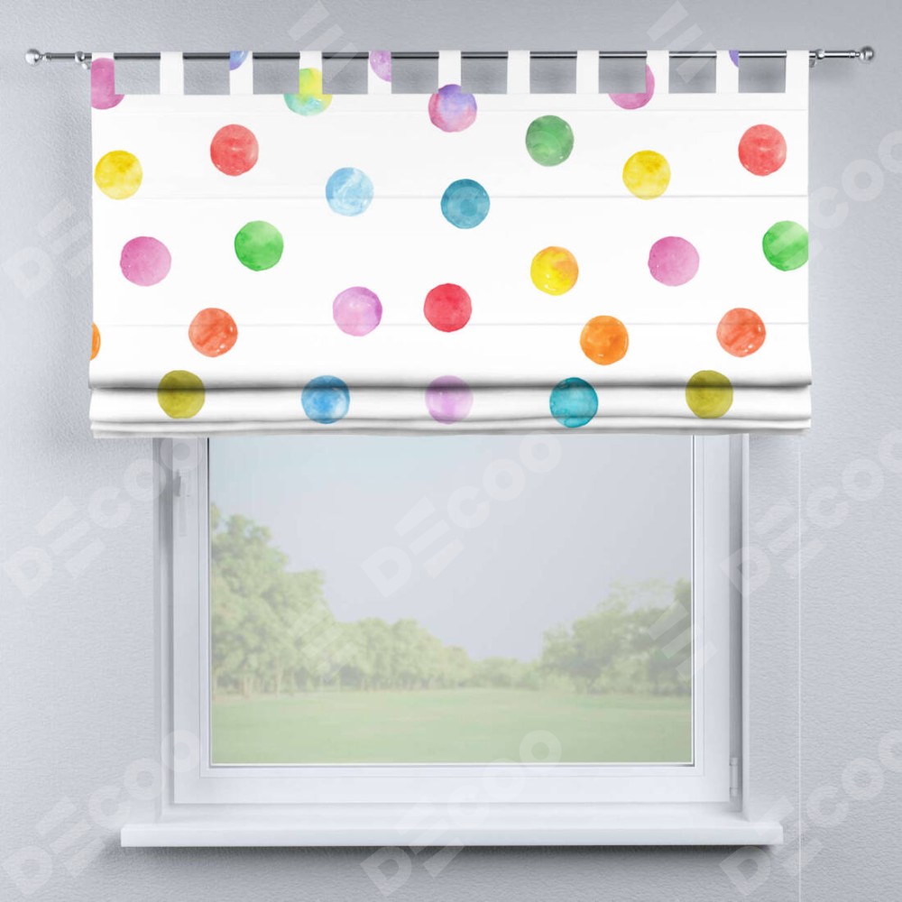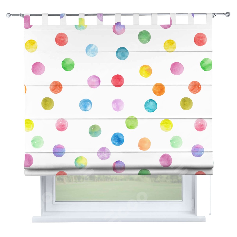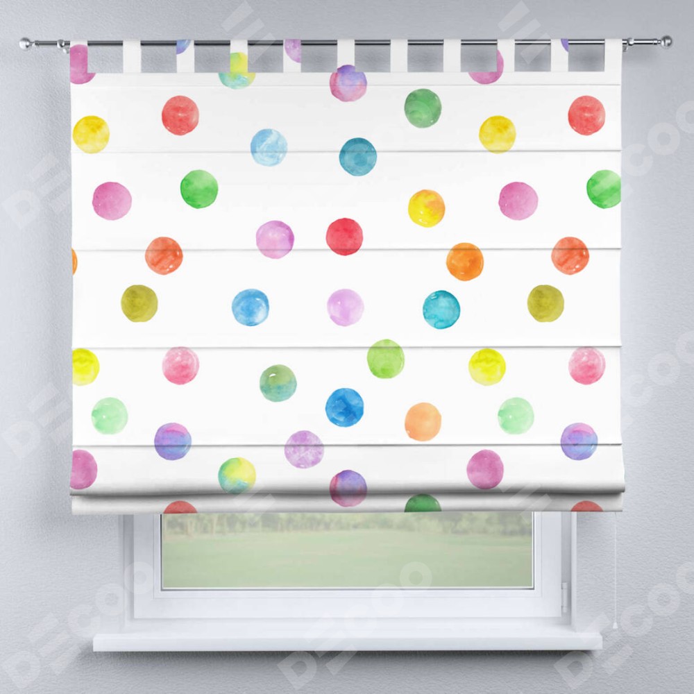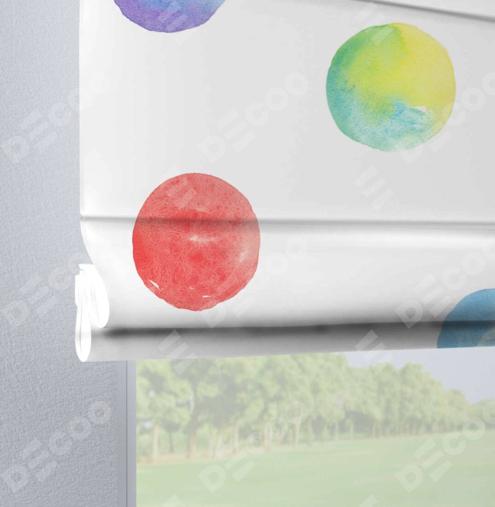 Римская штора производителя «Cortin», используется для проёма, пошита из ткани блэкаут с нанесением сублимационной печати «Цветные круги». Данная модель пошита на петлях, комплектуется на выбор круглым карнизом и подходит для монтажа на стену. Римская штора на петлях имеет простую систему регулировки высоты, отличительным преимуществом данной модели является простой способ монтажа. Достаточно повесить ее на трубу и штора готова!